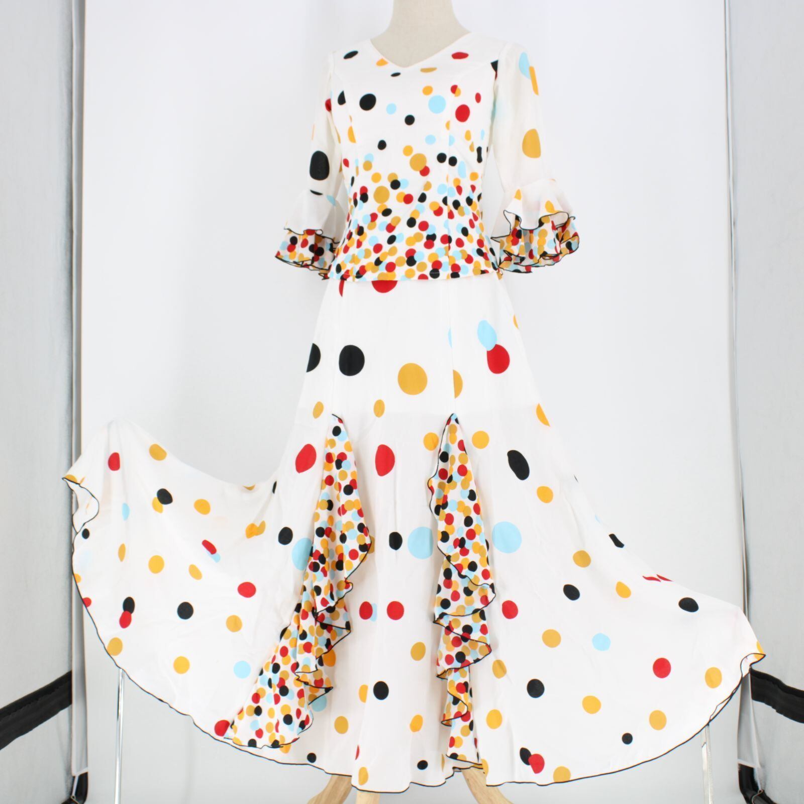 【美品 フラメンコ衣装】ホワイト Naomi collection ナオミコレクション 上下セット ツーピース 白 ボランテ 水玉 ドット