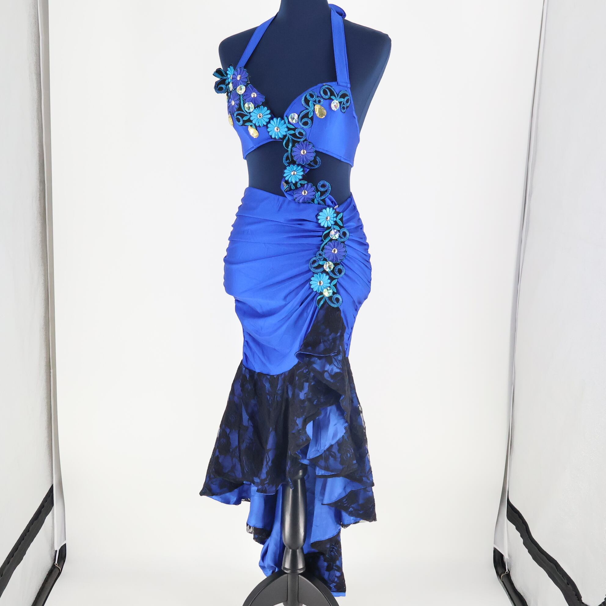 #ベリーダンス #オリエンタル衣装 #青 #ラインストーン #花柄 #ストレッチ素材 #お洒落 #セクシー #ダンス衣装 #パフォーマンス #コスチューム #フリル #レース #鮮やか #ダンス #パーティー #エレガント #ファッション #衣装セット #ENUTSU