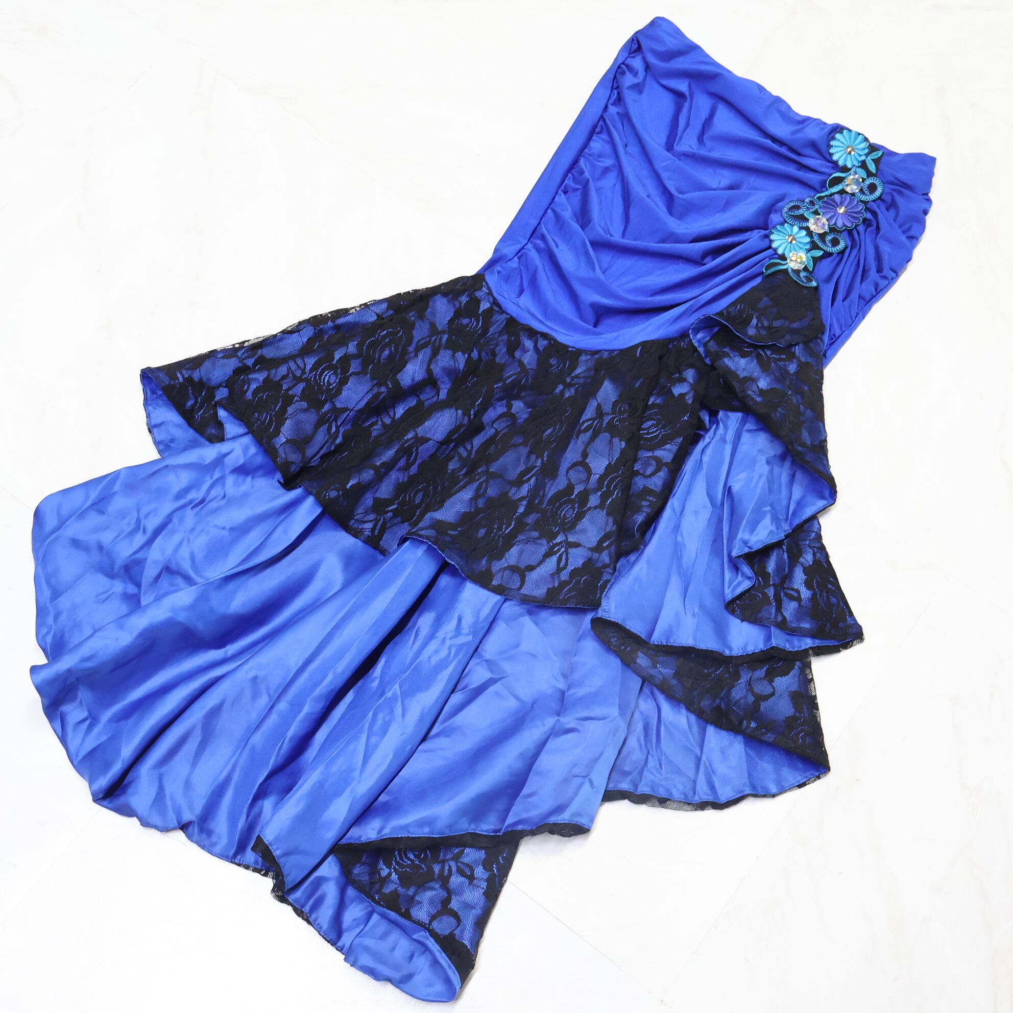 【ベリーダンス用 オリエンタル衣装】ブルー ラインストーン 花柄 青 水色 レース フリル ストレッチ素材 お洒落 セクシー ベリーダンス オリエンタル 衣装 セット スカート トップス ダンス コスチューム エレガント 鮮やか 輝く パフォーマンス着用