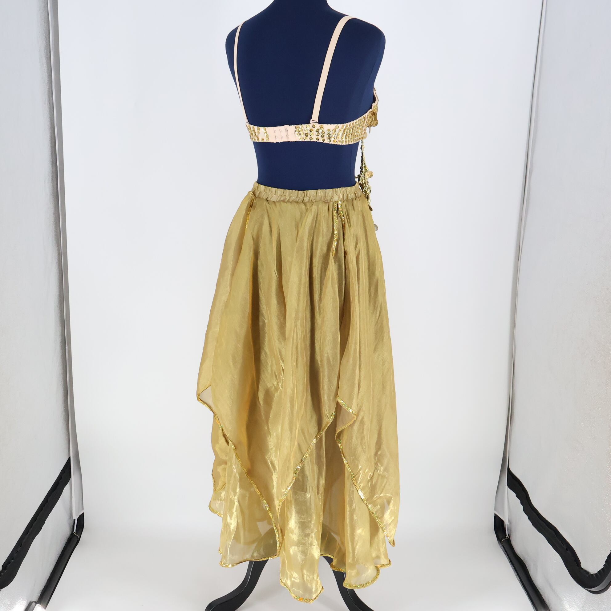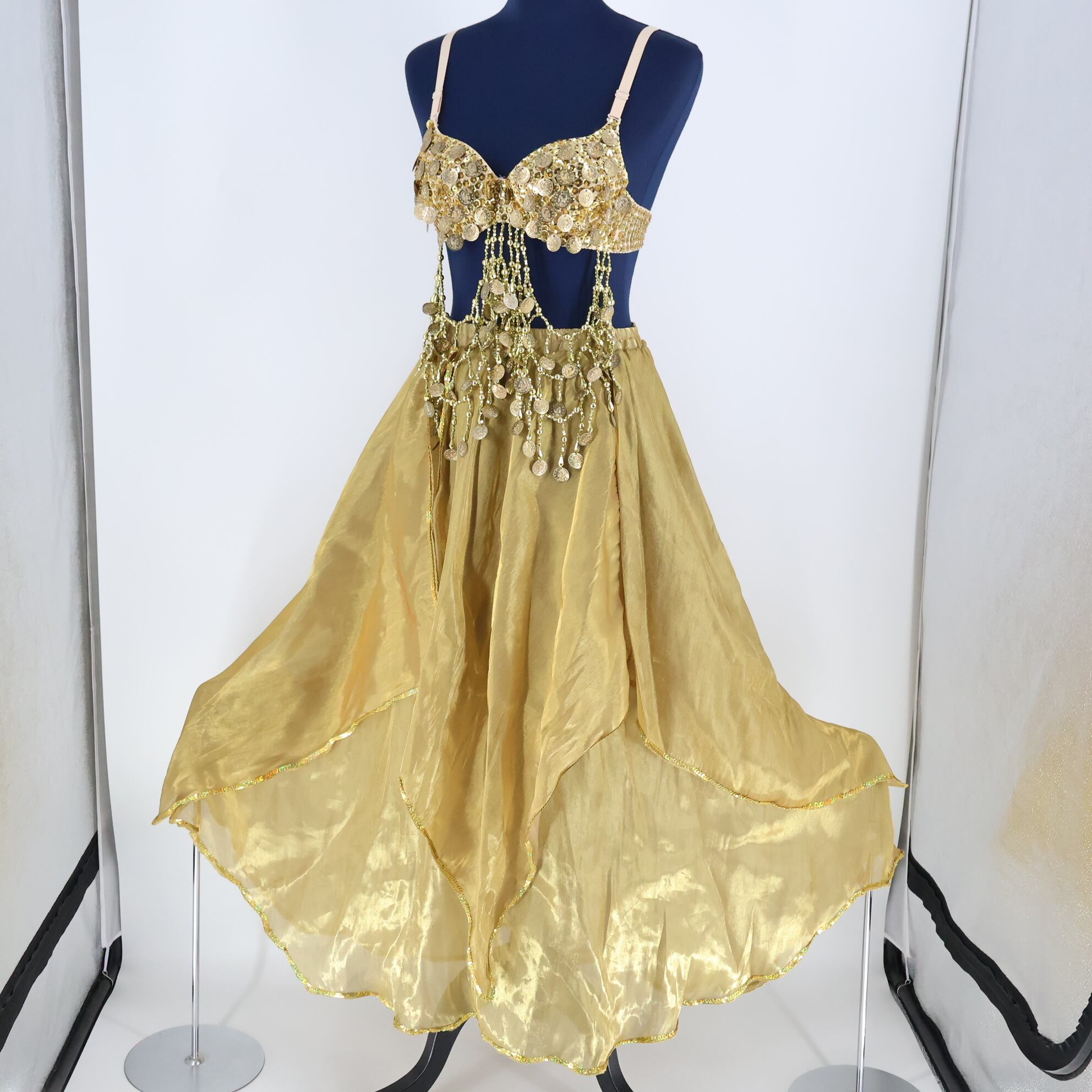 【ベリーダンス用 オリエンタル衣装】ゴールド コイン スパンコールラメ 多数 光沢 金 レース 華やか 豪華 煌びやか オシャレ トップス スカート セット 綺麗な色使い ダンスステージ 大人用 エレガント 飾り付き