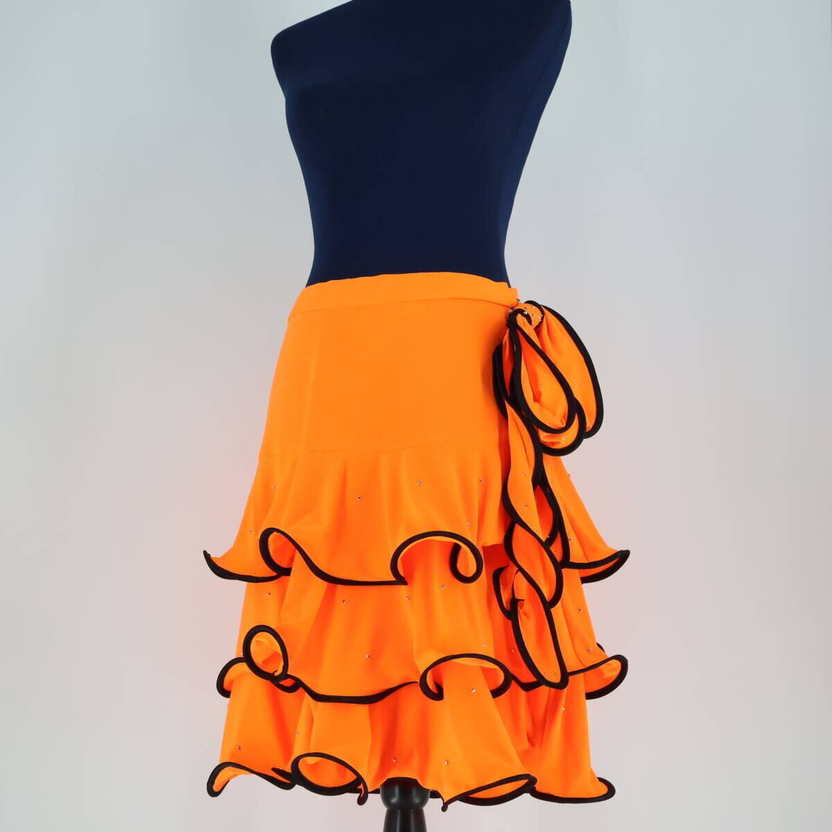 【美品 日本製 社交ダンス衣装】オレンジ SEKINE セキネ ラテン スカート ブラック 黒 フリル 段々 蛍光 リボン 目立つ 無地