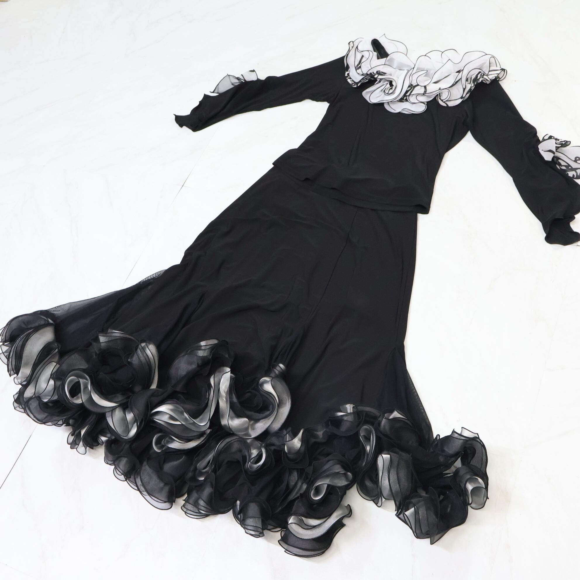 #社交ダンス衣装 #フリルトップス #ボリュームスカート #ブラックドレス #練習着 #ダンスファッション #パーティードレス #GigotPrestage #ジゴノンプレステージ #デザイン #ステージ衣装 #素材感 #伸縮性 #背面ファスナー #おしゃれ #かわいい #大人女性 #ダンスパフォーマンス #日本製 #ENUTSU