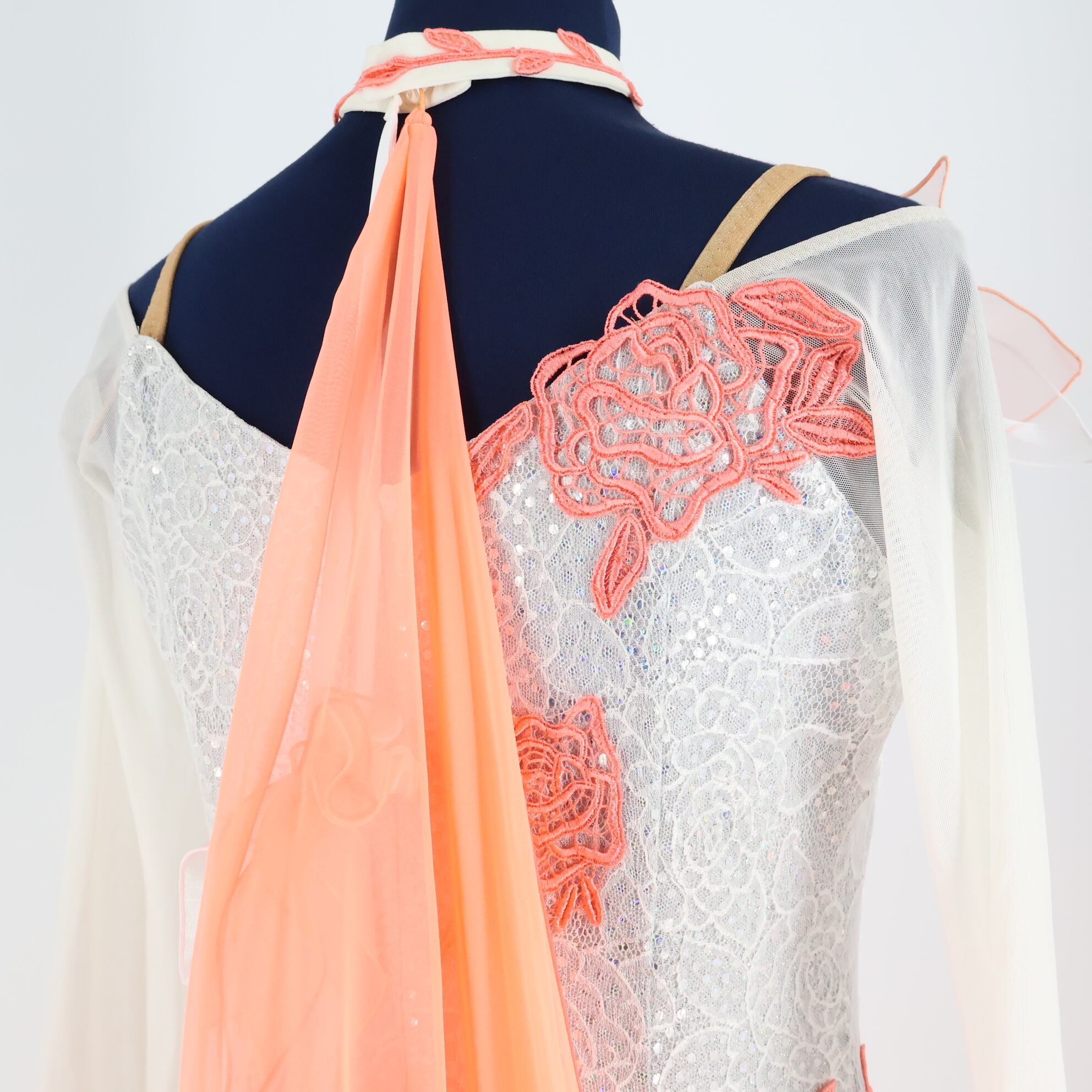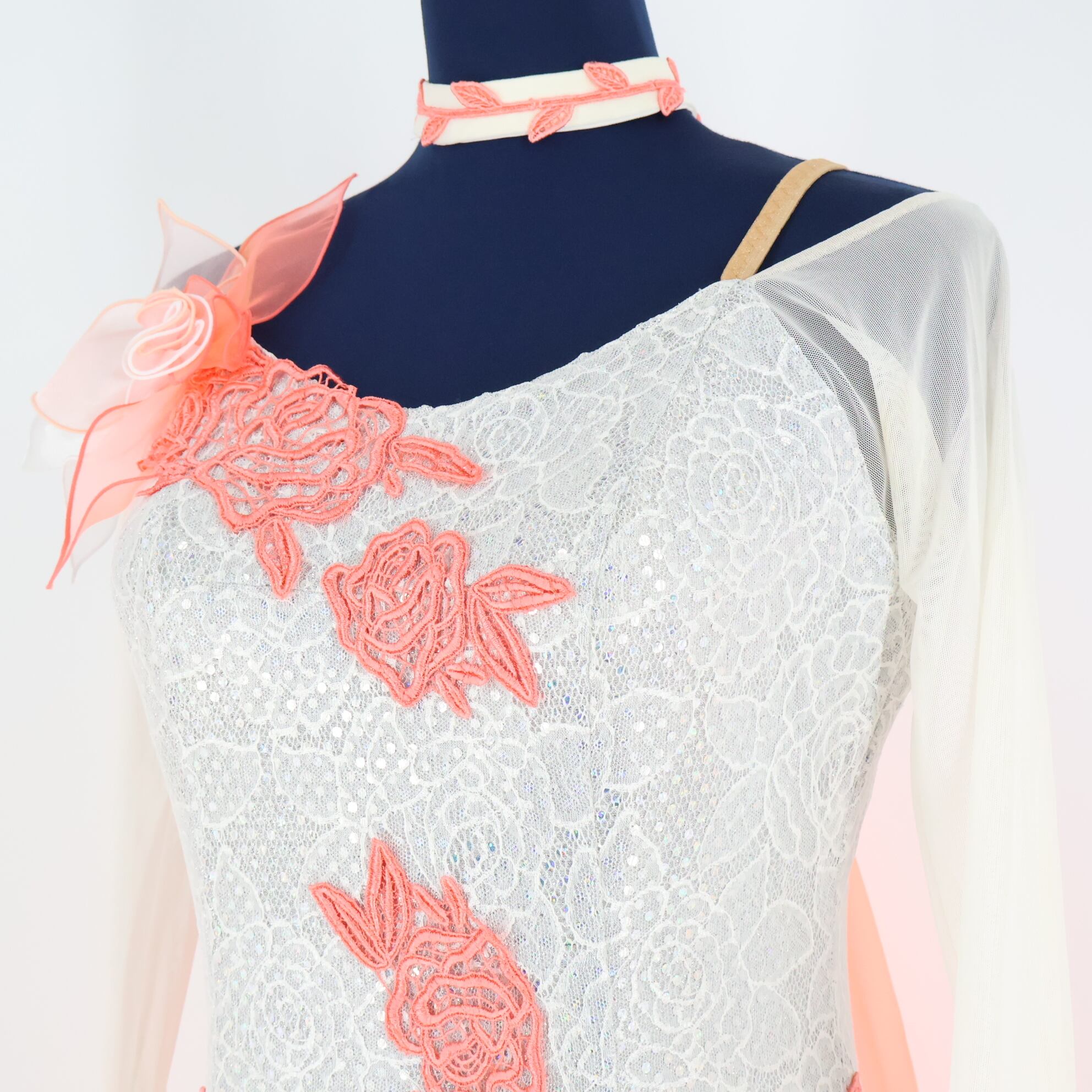 #社交ダンス #ダンス衣装 #ワンピース #ドレス #日本製 #SEKINE #セキネ #ホワイト #サーモンピンク #フロート #競技用 #パーティ #おしゃれ #ファッション #特別な日 #ダンスパフォーマンス #女性用 #伸縮性 #胸パッド #ENUTSU