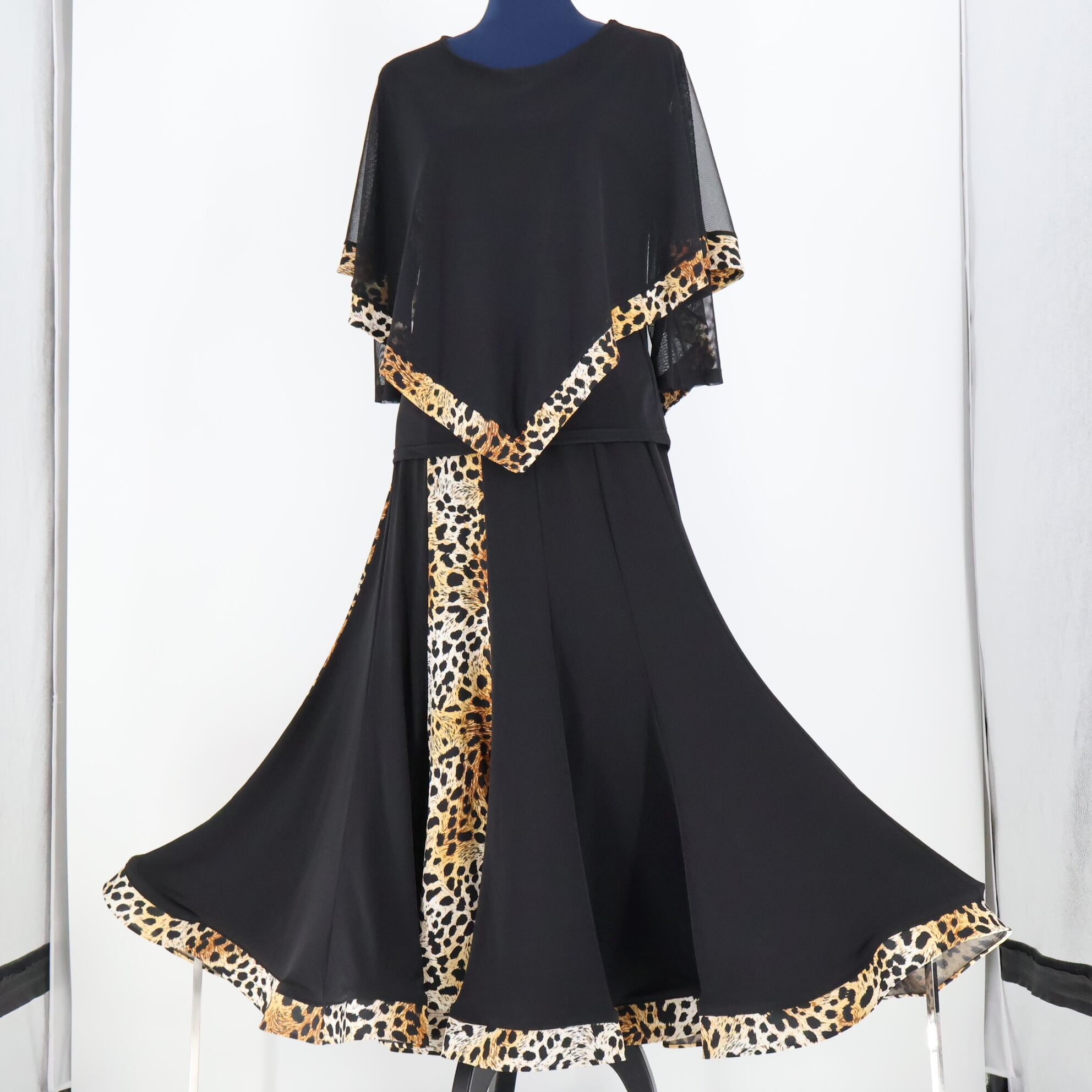 【美品 社交ダンス衣装】ブラック TAKADANCE タカダンス 上下セット ツーピース 黒 ヒョウ柄 レッスン パーティ 伸縮 発表会