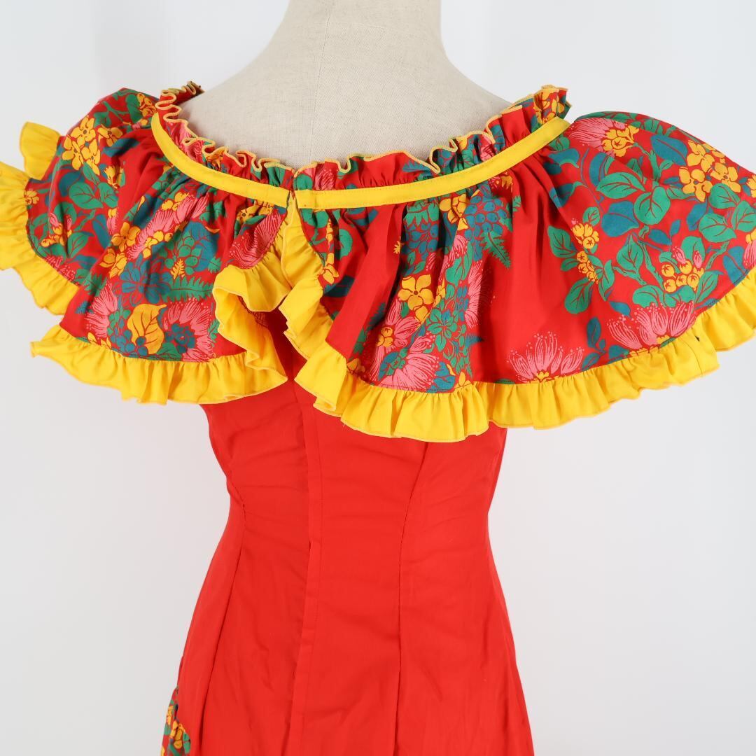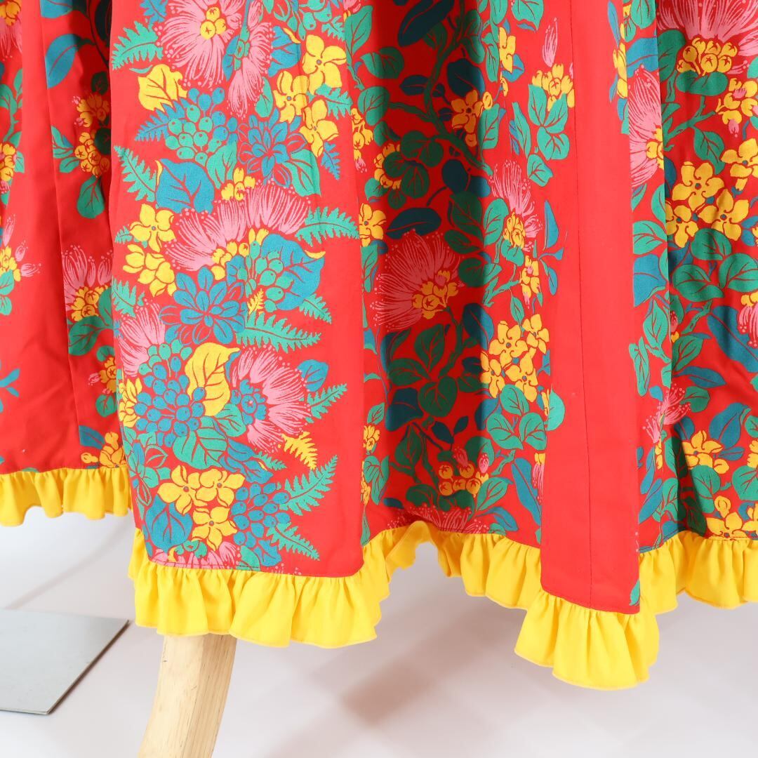【日本製 フラダンス衣装】レッド Paondor パンドール ワンピース ドレス レフア柄 黄 フリル 花柄 緑 鮮やか イエロー 可愛い