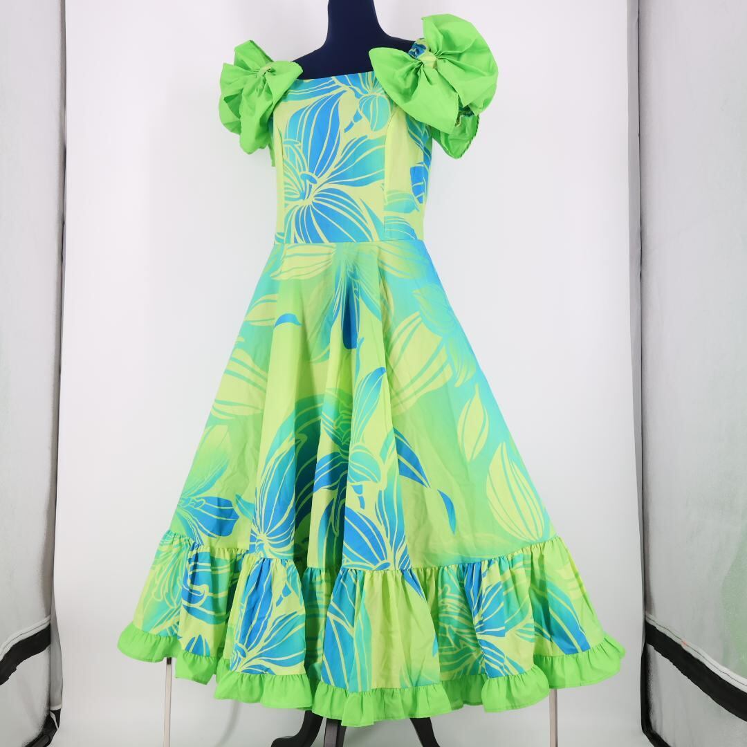 【ハワイ製 フラダンス衣装】ライトグリーン TorchGinger トーチジンジャー ワンピース ドレス リボン 水色 黄緑 フリル 花柄