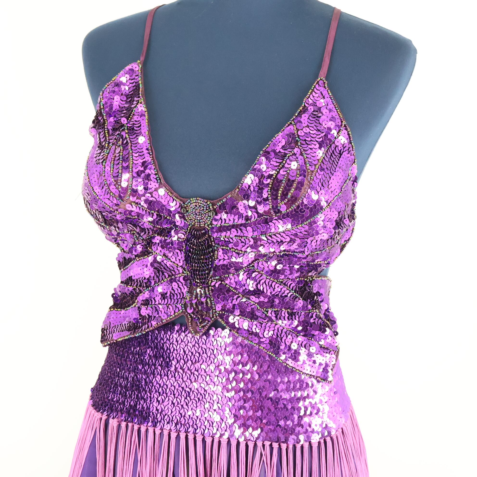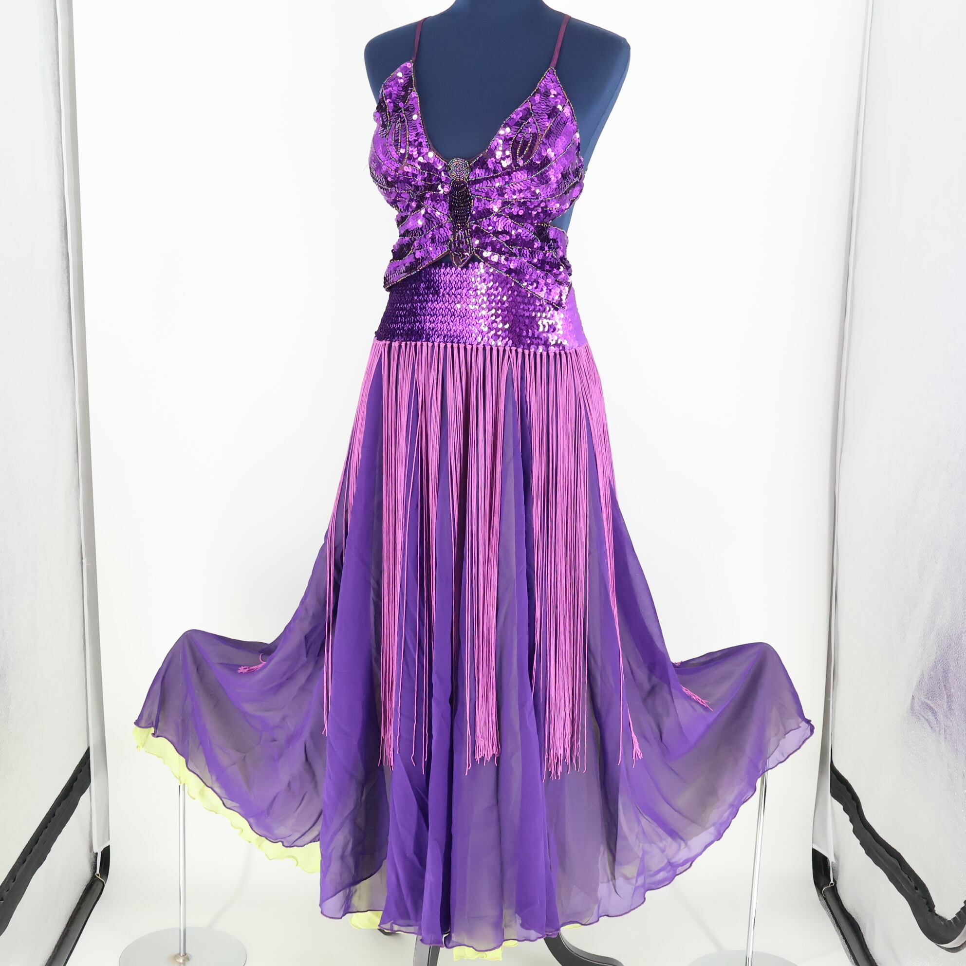【ベリーダンス用 オリエンタル衣装】パープル スパンコールラメ 豪華 蝶 ラメ 紫 黄緑 煌びやか フリル レース 華やか トップス スカート ベルト セット ダンス パフォーマンス スカート丈 伸縮性 ウエストゴム スリット