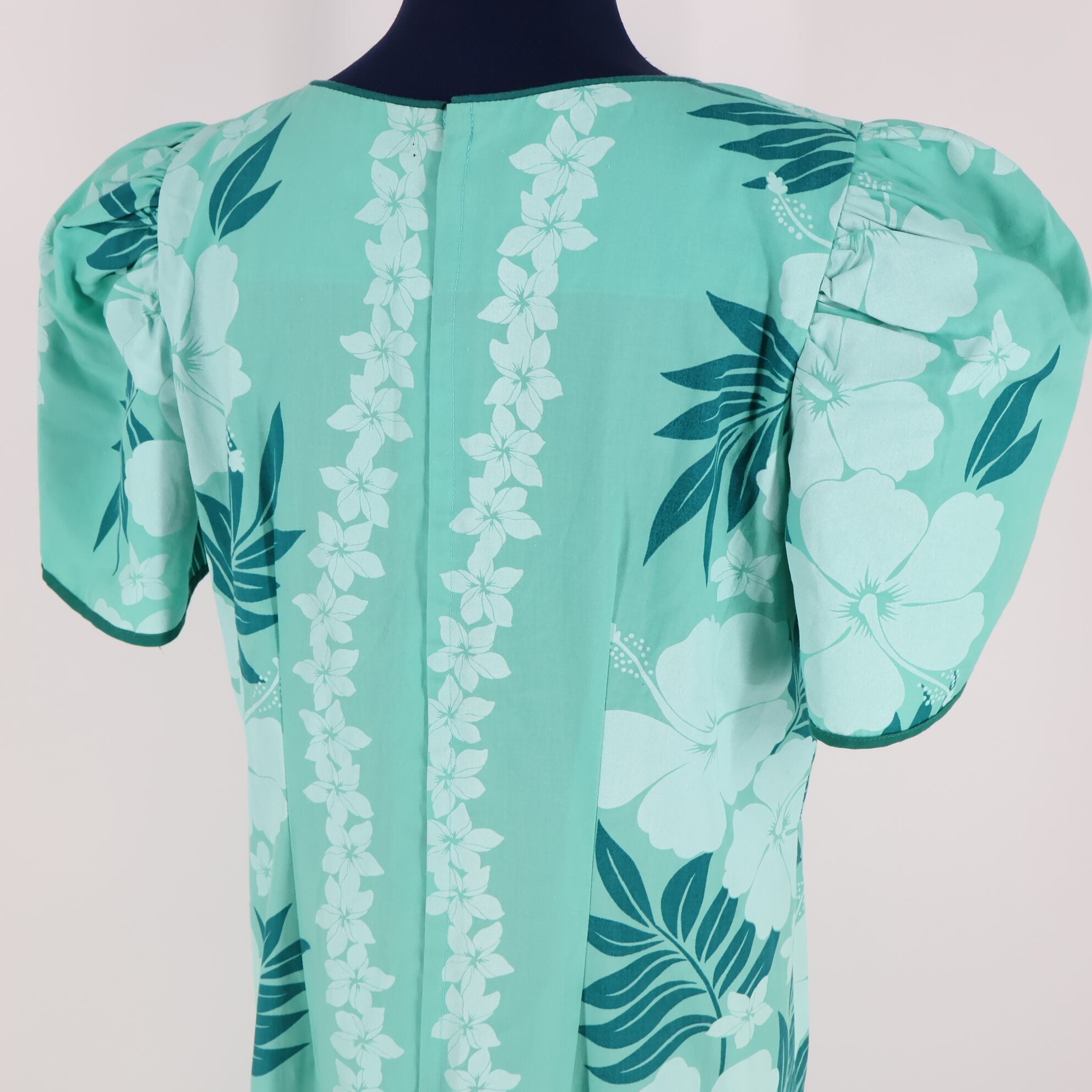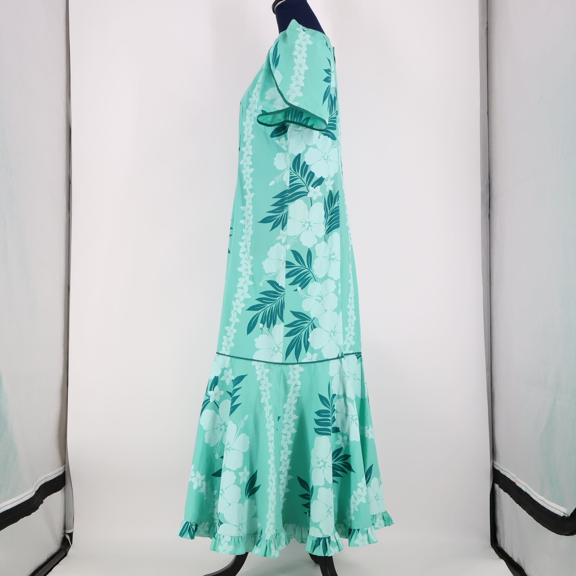 【フラダンス衣装】グリーン ワンピース ドレス ハイビスカス柄 プルメリア柄 ホワイト 緑 白 爽やか 明るい 半袖 かわいい 花