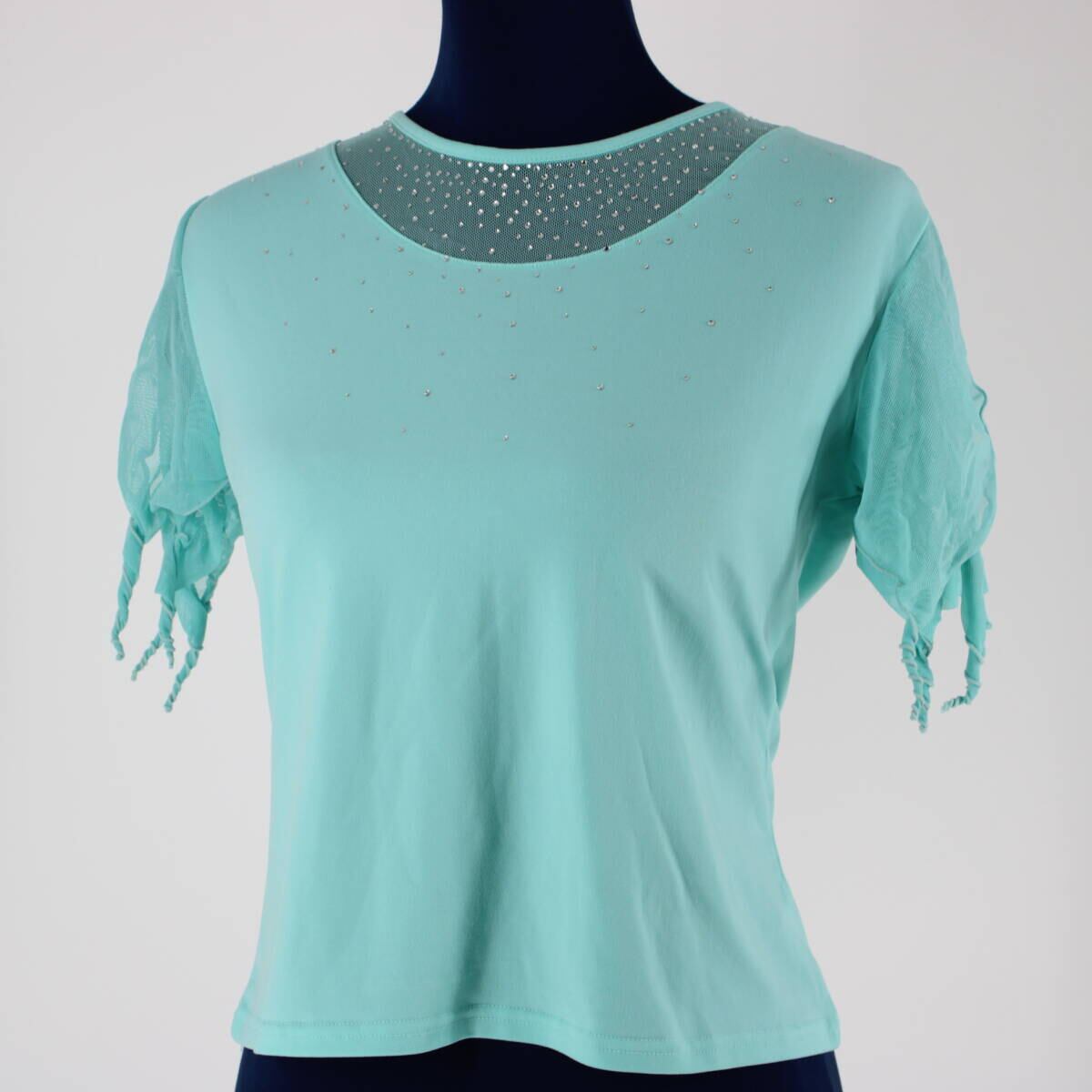 【美品 社交ダンス衣装】トップス レッスンウェア 練習着 Lサイズ 水色 ライトブルー ラインストーン かわいい 可愛い 清楚