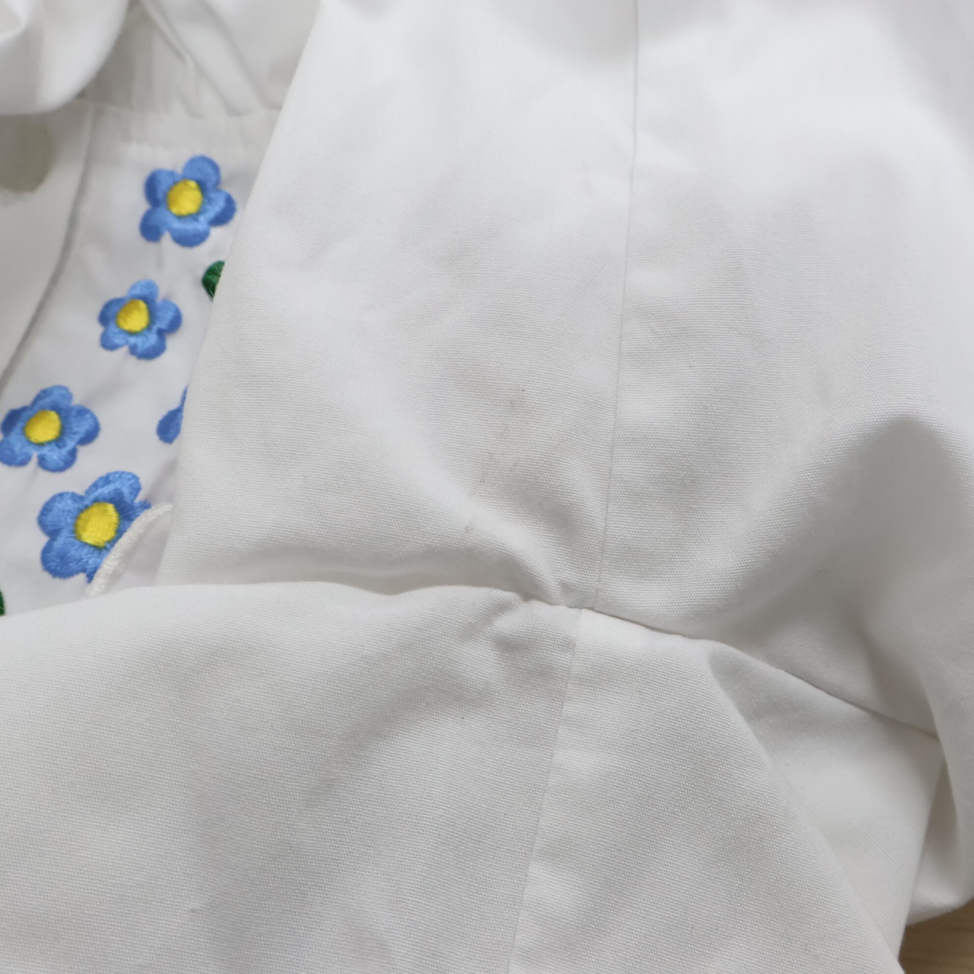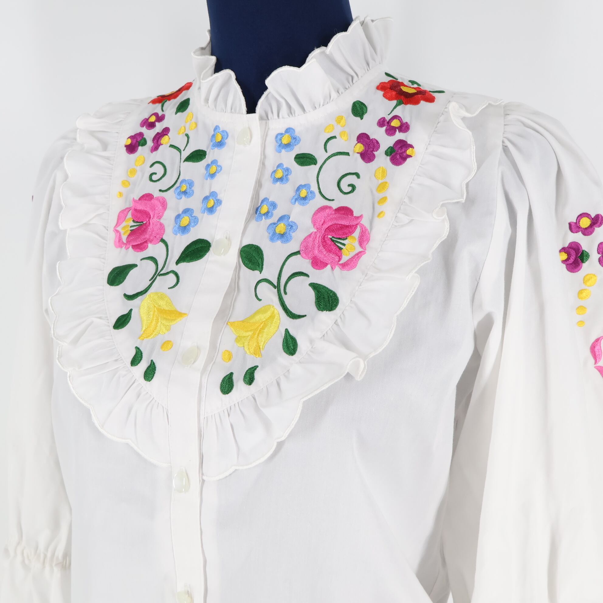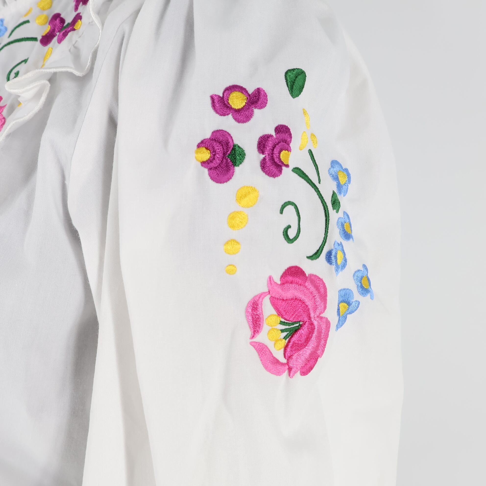 #フォークダンス衣装 #AURORA #ホワイトブラウス #カラフル刺繍 #花柄刺繍 #刺繍トップス #フリルブラウス #七分袖 #ピンクアクセント #赤ポイント #黄色デザイン #水色ディテール #紫カラー #緑アクセント #爽やかコーデ #ダンス衣装 #ダンスコスチューム #ステージ衣装 #古着 #中古 #ENUTSU