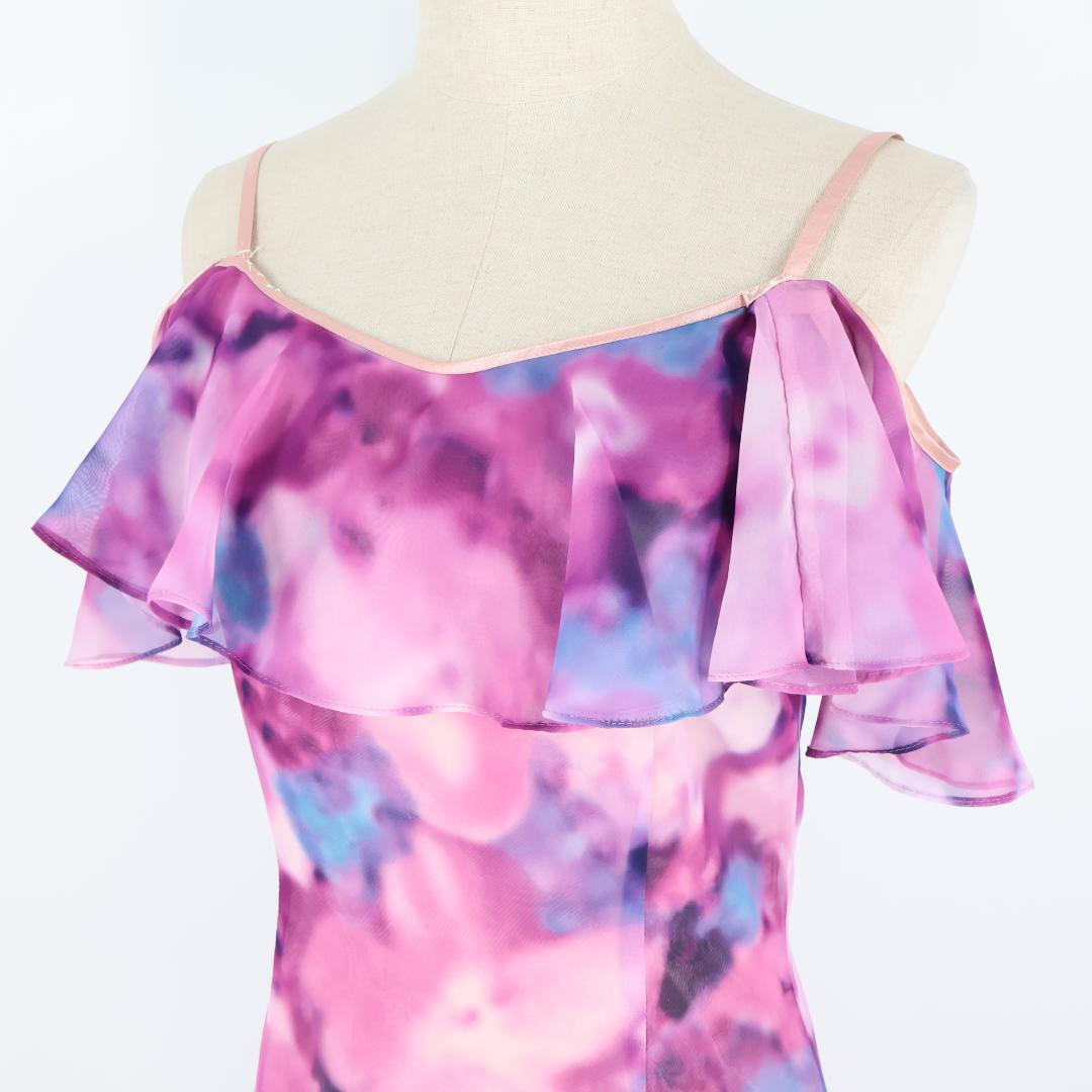 【フラダンス衣装】パープル ワンピース ドレス 紫 グラデーション ピンク オフショルダー 透け感 華やか 鮮やか フリル 水色