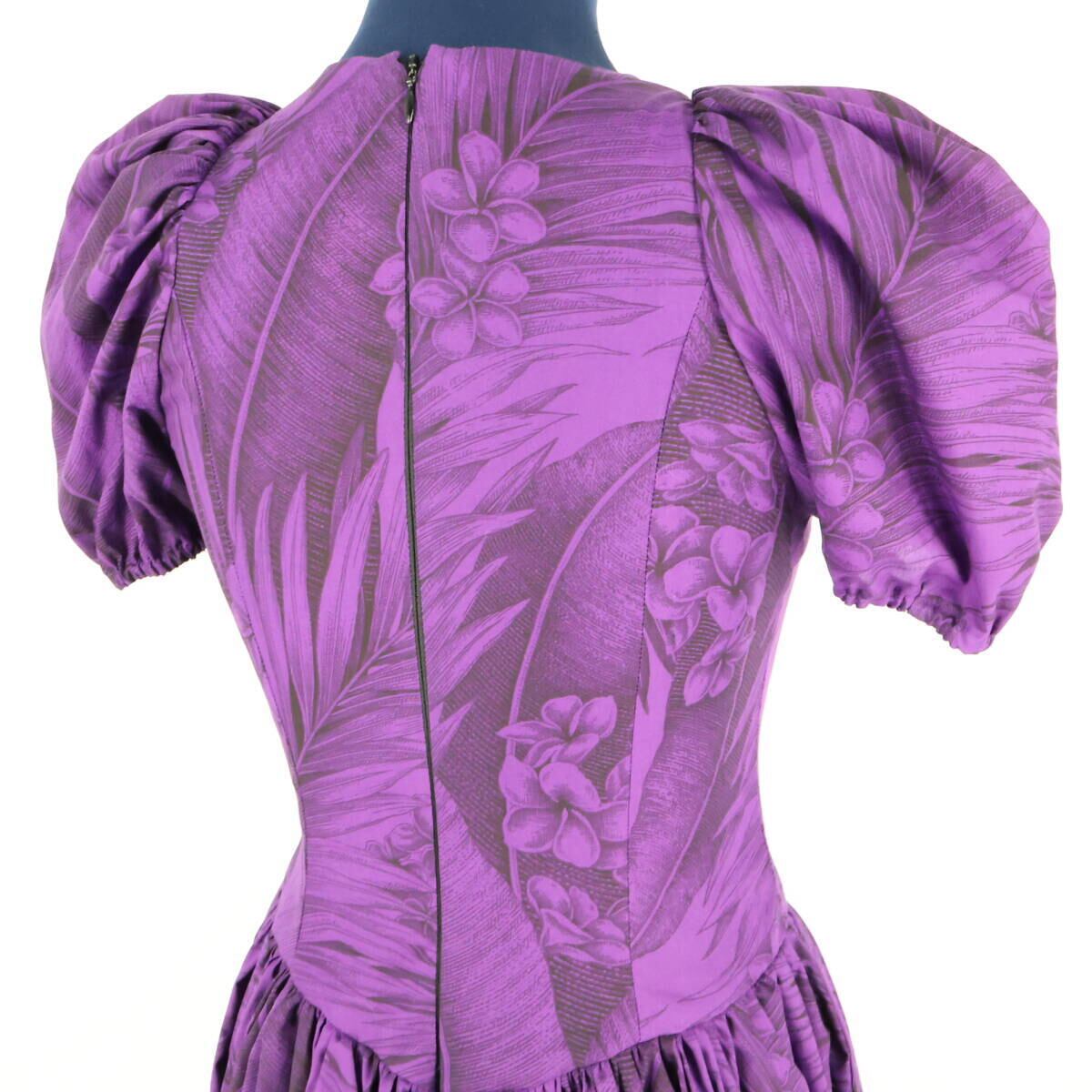 【美品 アメリカ製 フラダンス衣装】パープル MUUMUU PARADISE ワンピース ドレス 紫 プルメリア柄 花柄 パフスリーブ 可愛い