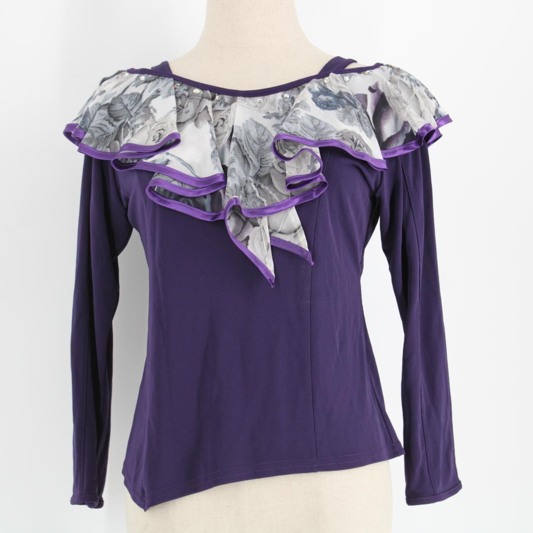 【日本製 社交ダンス衣装】パープル Lindo リンド ブラウス トップス カットソー 紫 フリル レース グレー 花柄 上品 レッスン