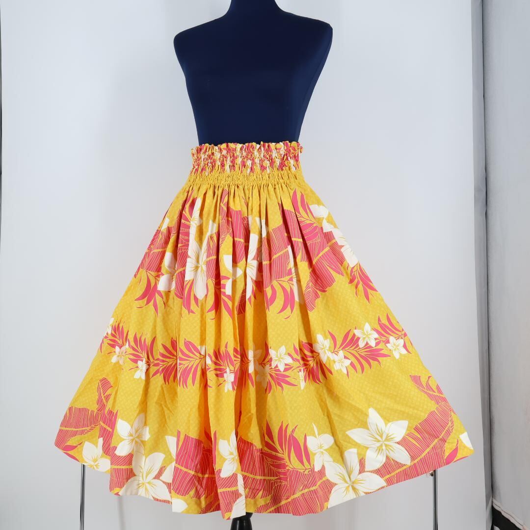 【日本製 フラダンス衣装】イエロー Mamala Bay ママラベイ パウスカート プルメリア柄 花柄 黄 ピンク 鮮やか アロハ 可愛い