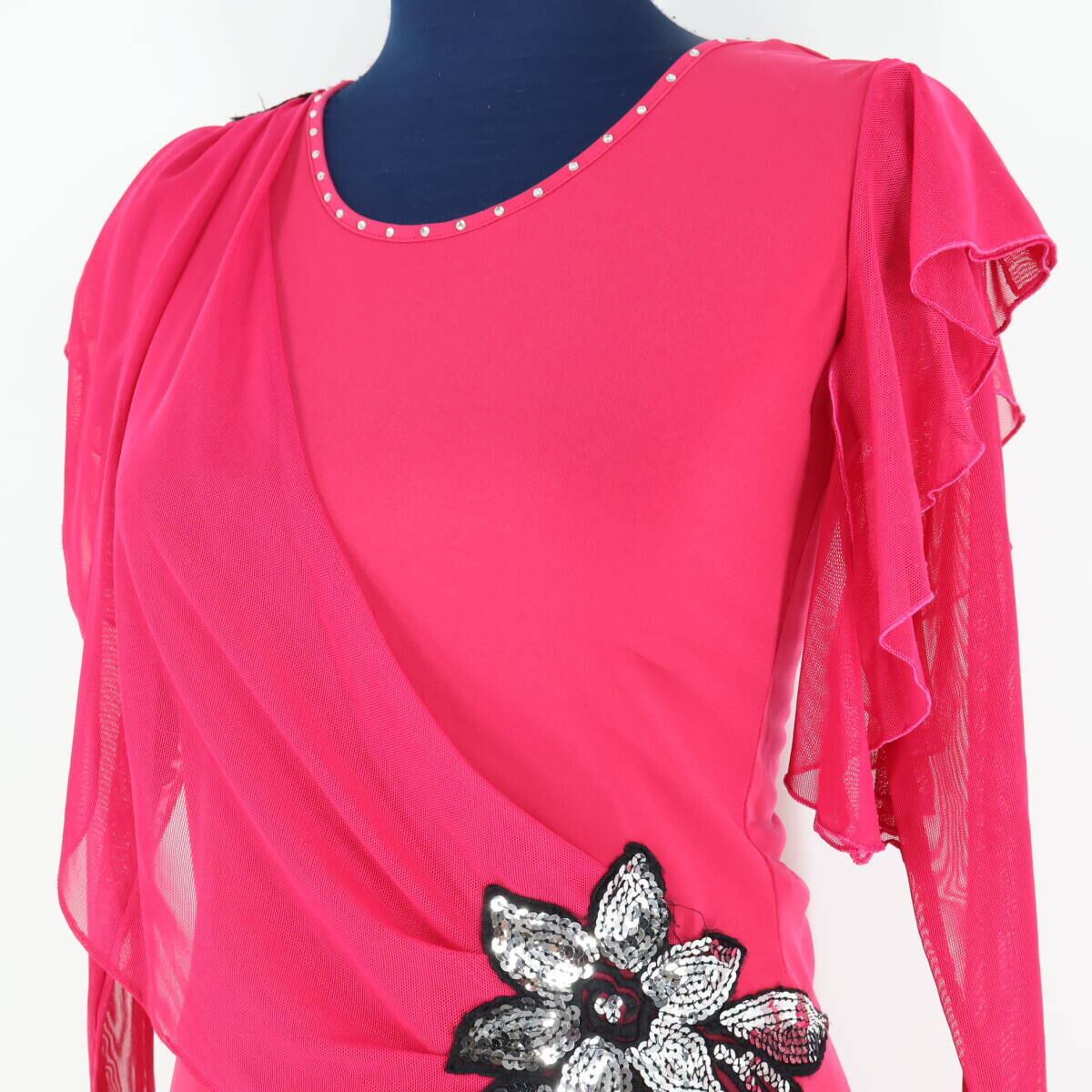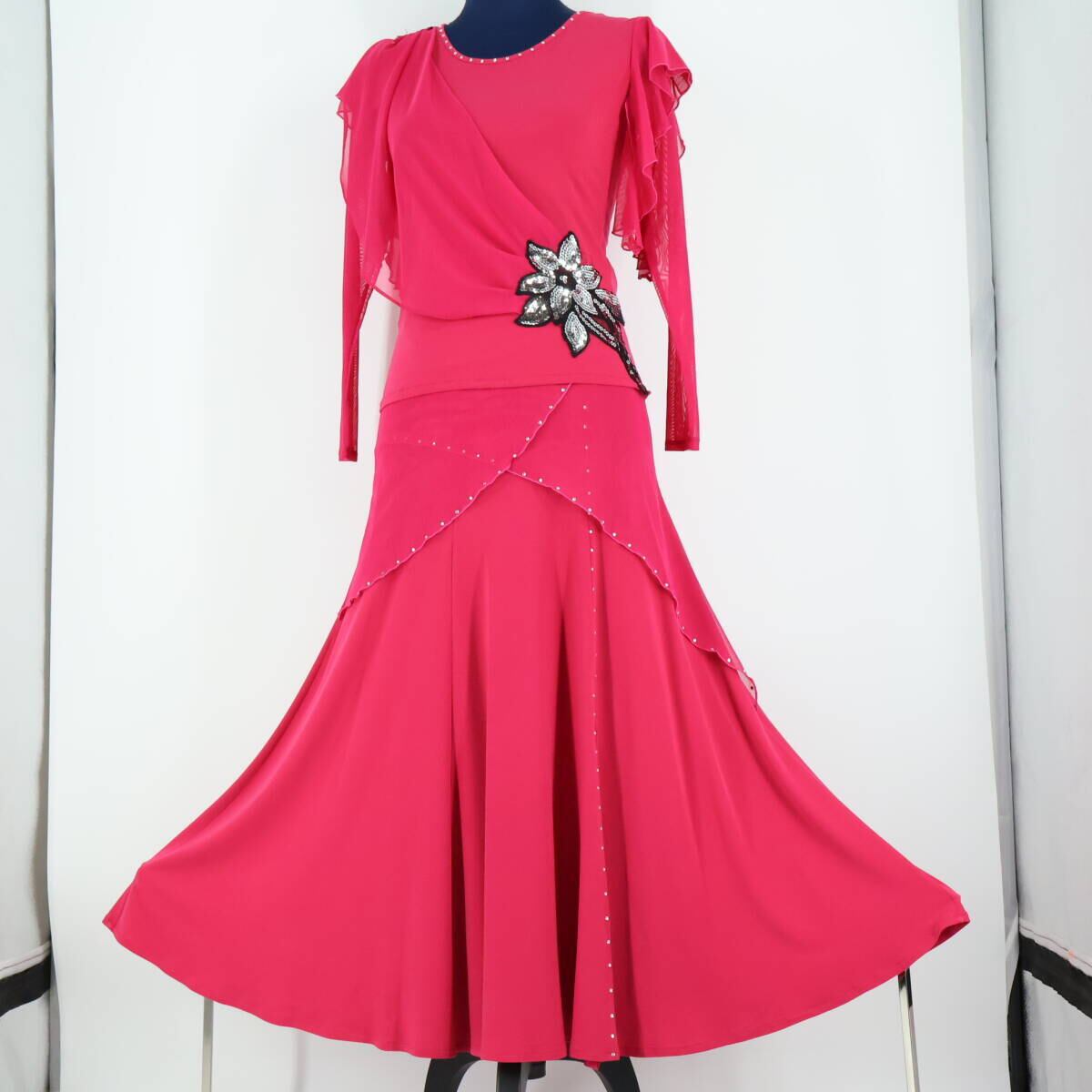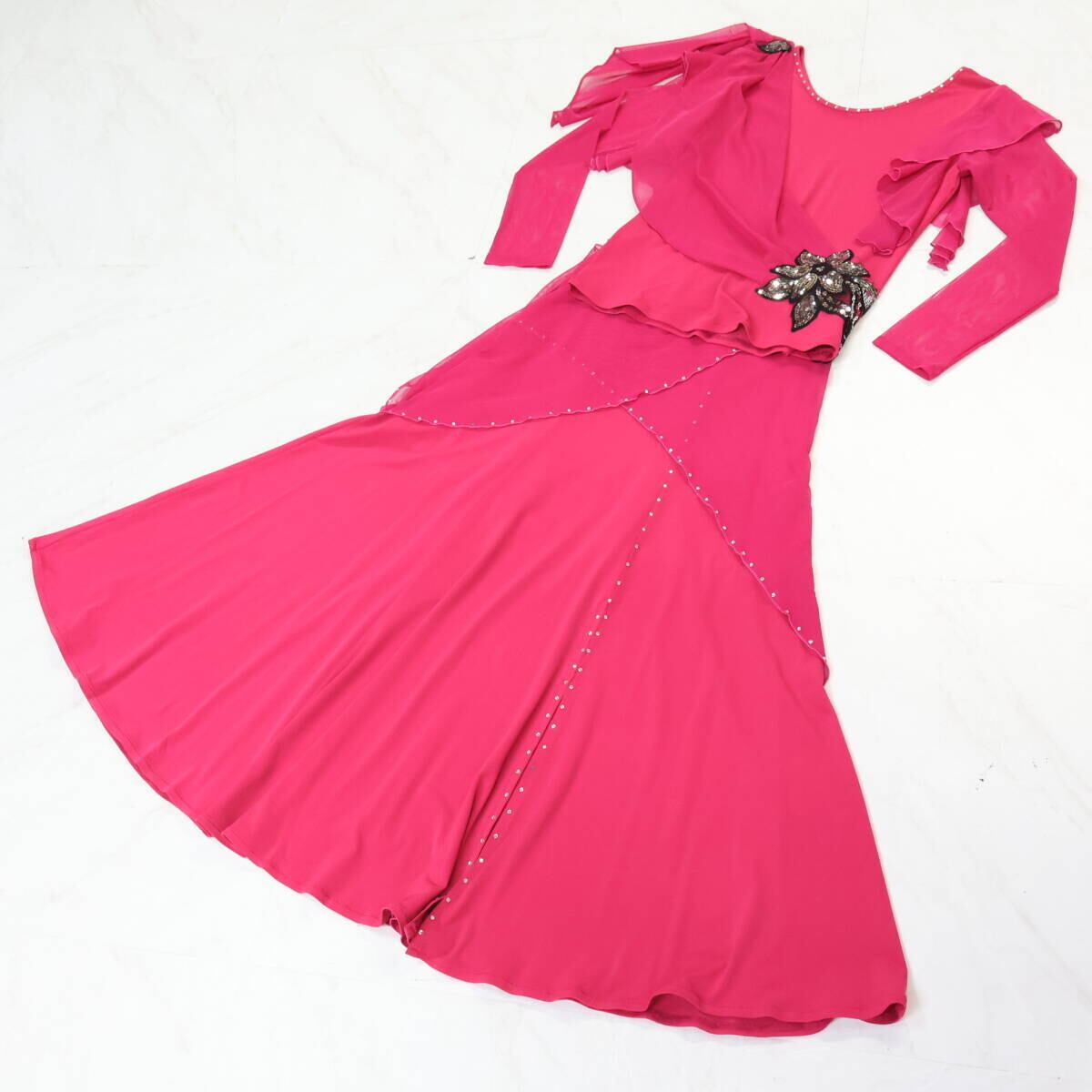 【美品 社交ダンス衣装】ピンク create-sun クリエイトサン 上下セット ツーピース セットアップ 花 伸縮 パーティ 発表会