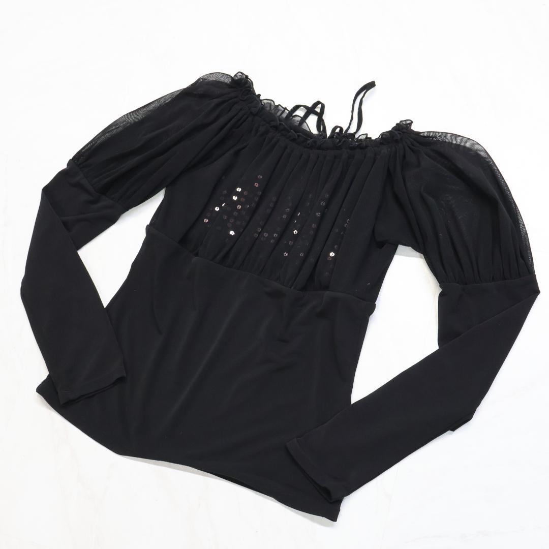 【美品 日本製 社交ダンス衣装】ブラック Chacott チャコット ブラウス トップス カットソー 黒 スパンコール 長袖 レッスン