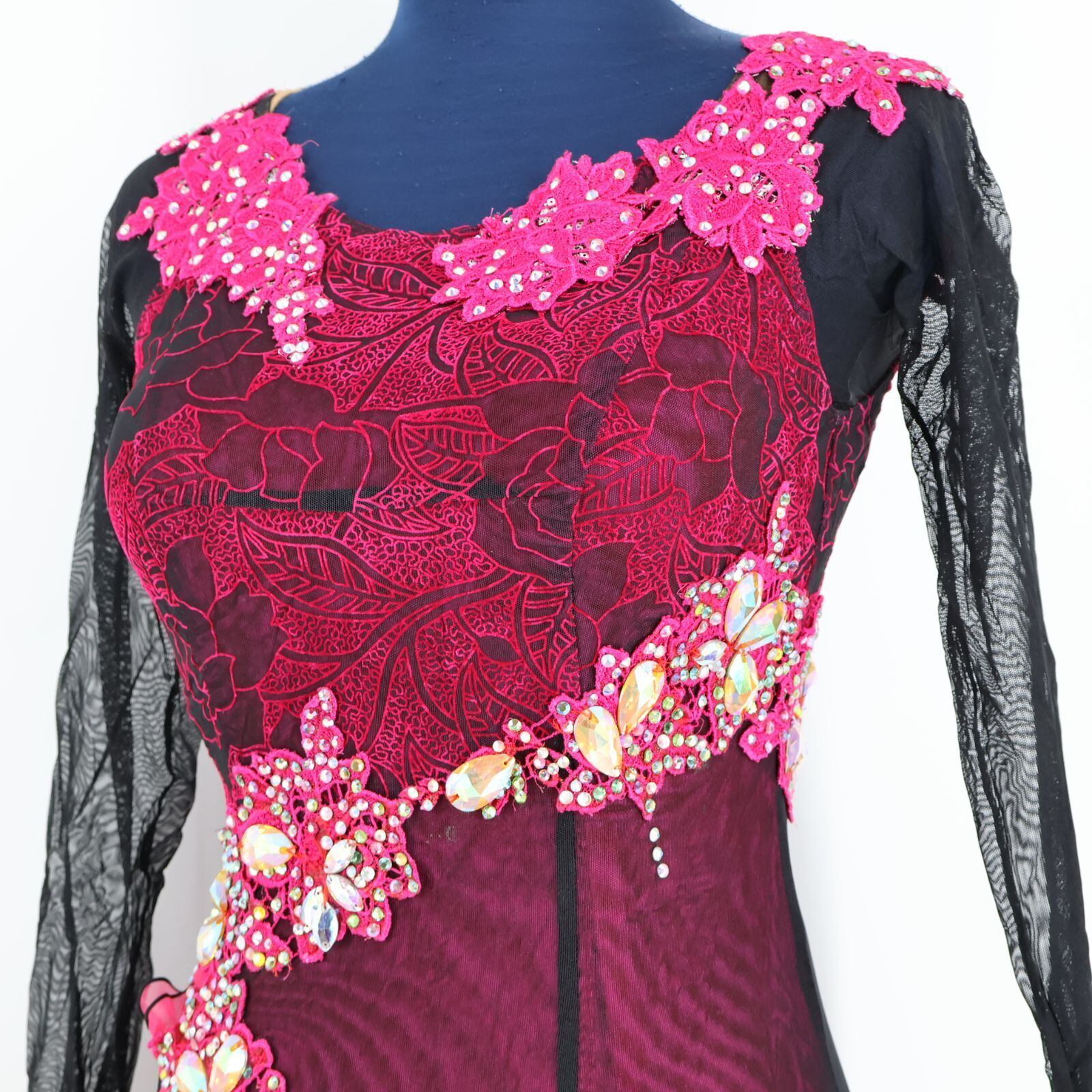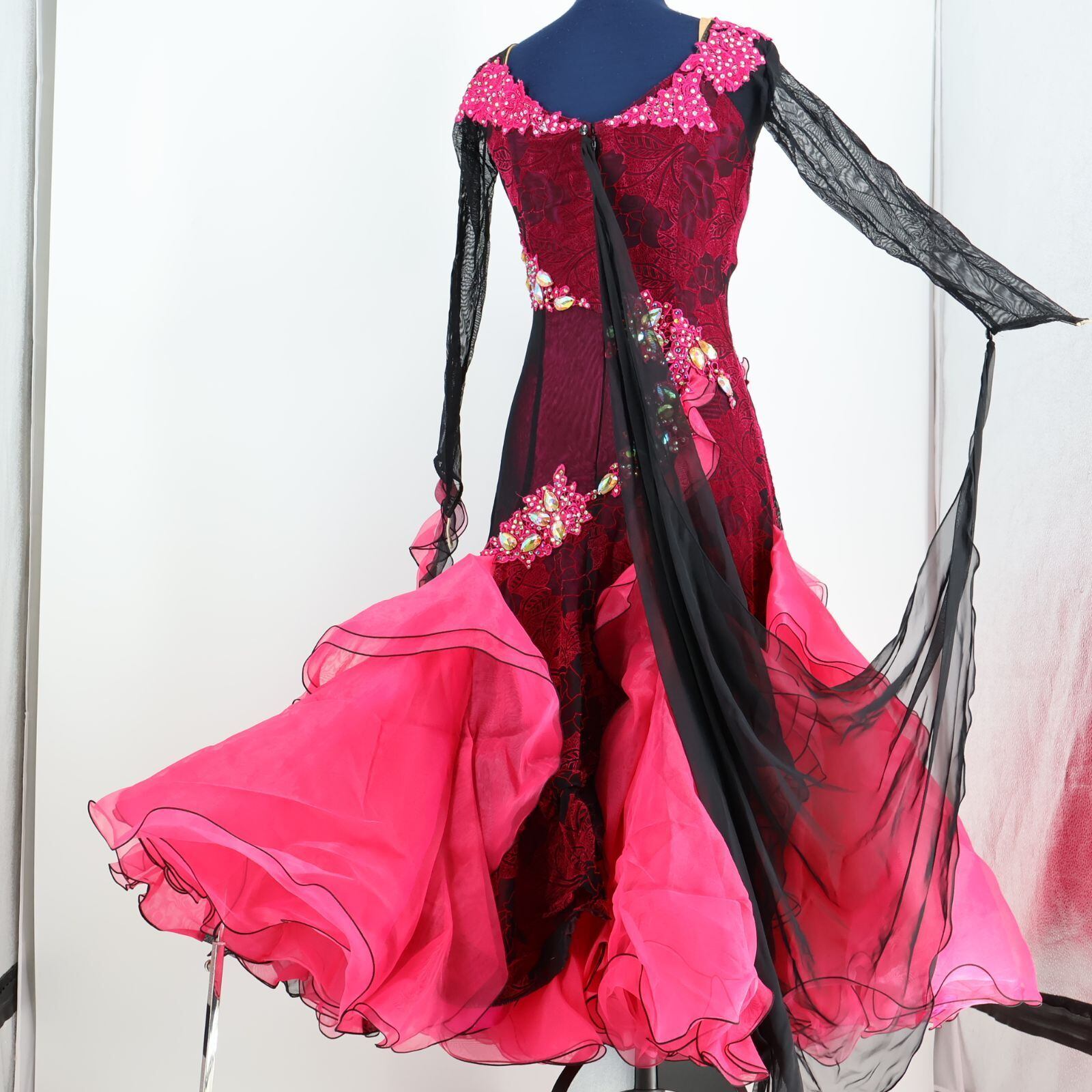 【美品 日本製 社交ダンス衣装】ピンク SEKINE セキネ ワンピース ドレス フロート 黒 ブラック フリル レース デモ 競技用
