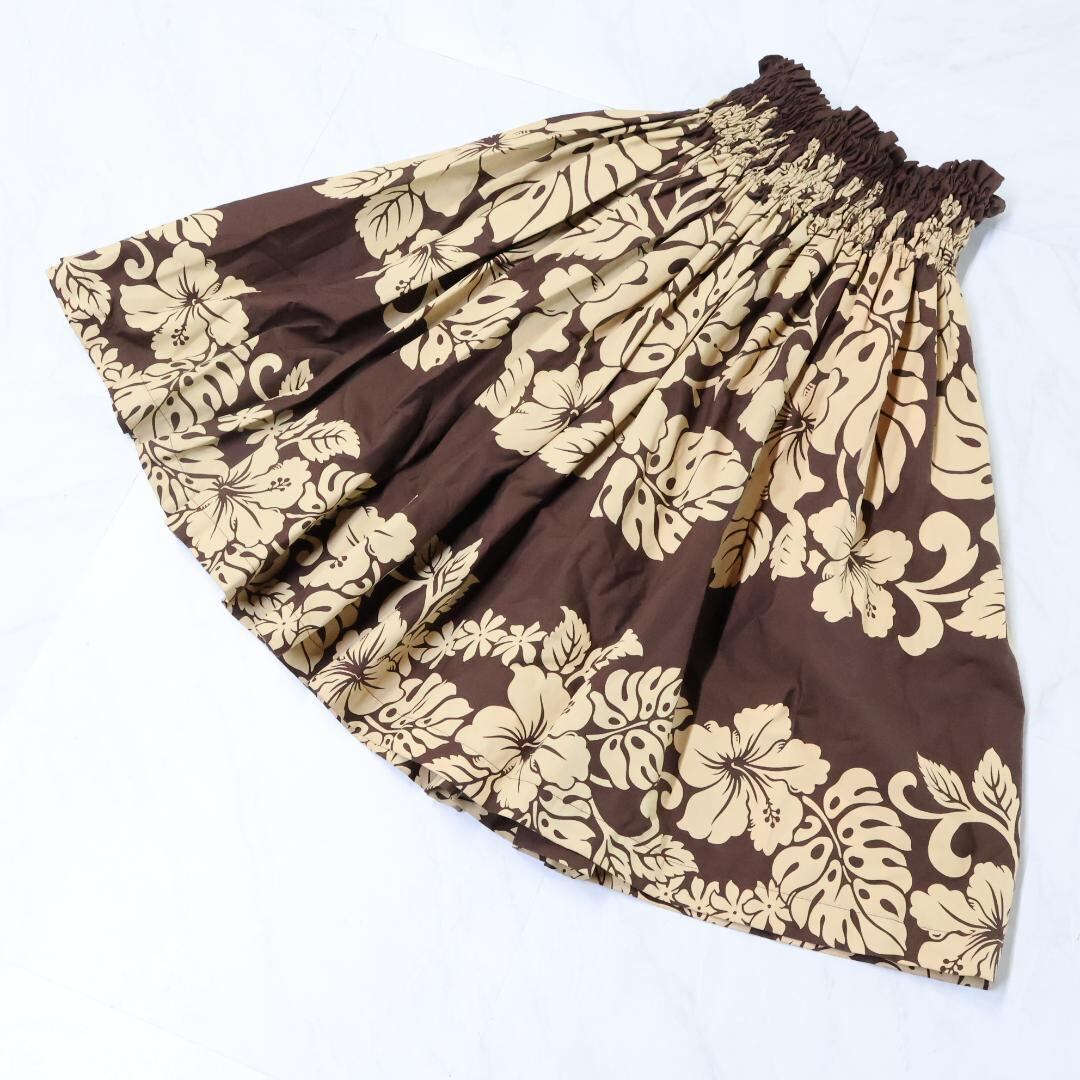 【日本製 フラダンス衣装】ブラウン セキノレーシングスポーツ パウスカート ハイビスカス柄 モンステラ柄 ベージュ 茶 可愛い