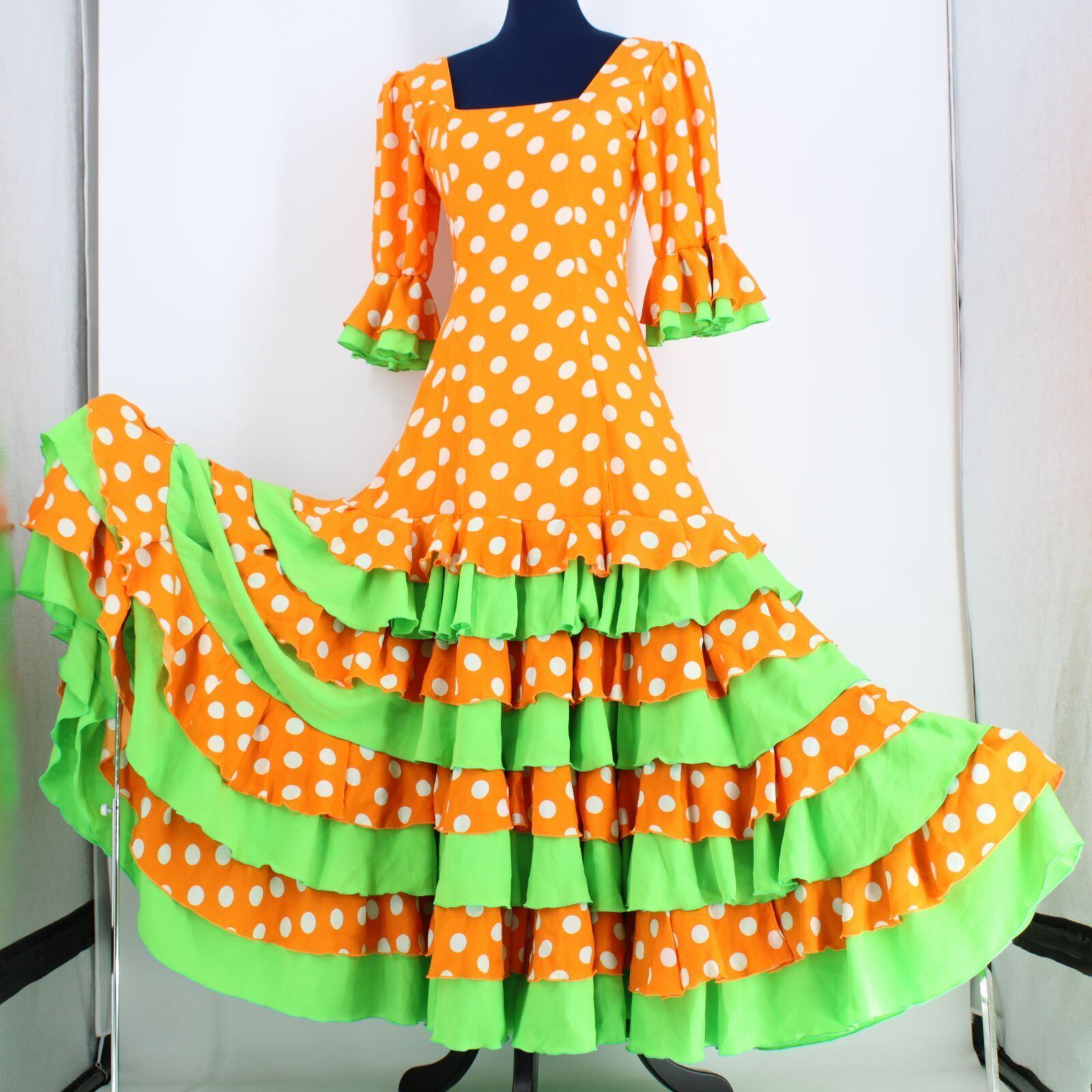 【美品 フラメンコ衣装】オレンジ ワンピース ドレス ボランテ 黄緑 緑 白 ドット 水玉 フリル 豪華 ボリューム ダンス用