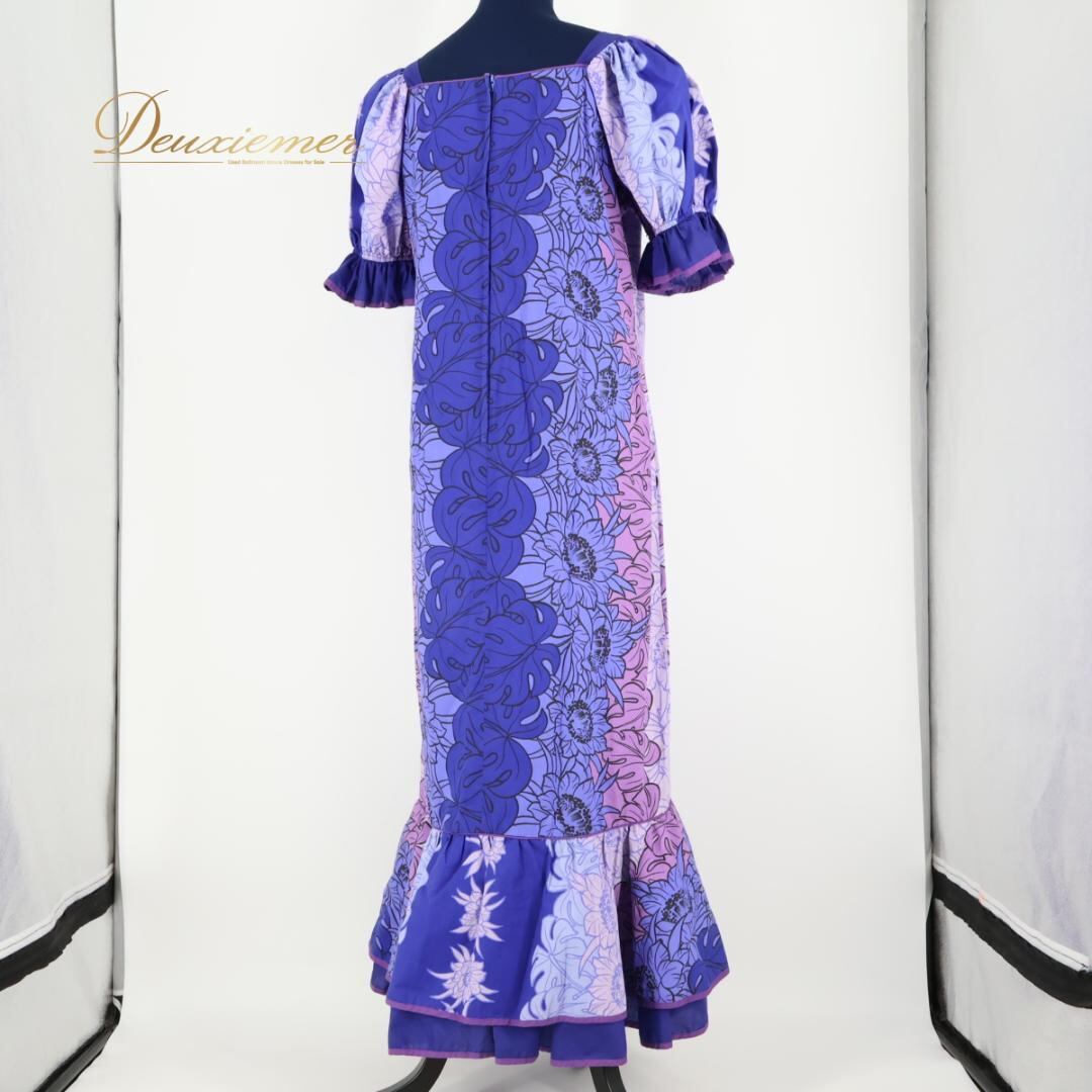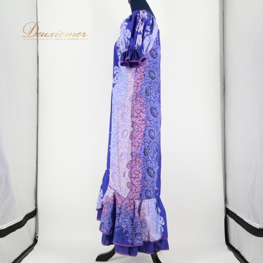 【ハワイ製 フラダンス衣装】ブルー T&L MUUMUU ワンピース ドレス 花柄 紫 青 パフスリーブ 絞り 華やか フリル かわいい
