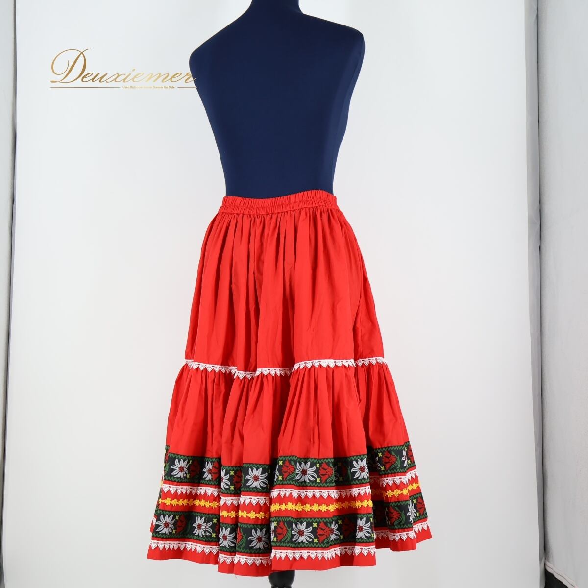 #フォークダンス衣装 #LOUIS #レッドスカート #赤スカート #花柄レース #レースデザイン #ホワイトアクセント #イエローポイント #鮮やかカラー #チロリアンスタイル #カントリーファッション #かわいいスカート #華やかコーデ #民族衣装風 #フリルスカート #ダンス衣装 #ダンスコスチューム #ステージ衣装 #古着 #中古 #ENUTSU