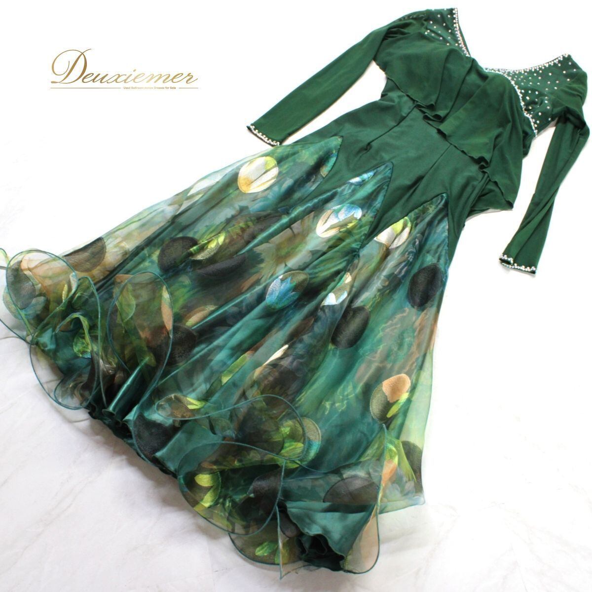 【 社交ダンス衣装】ワンピース ドレス 緑 深緑 グリーン Lサイズ ラインストーン 華やか 派手 豪華 目立つ かわいい 可愛い