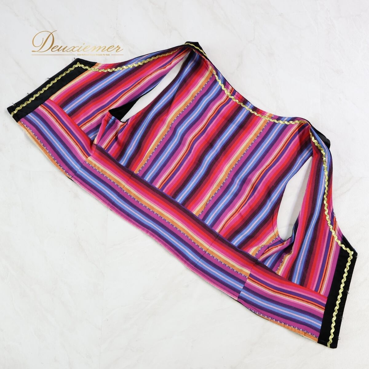 #フォークダンス衣装 #リバーシブルベスト #2wayベスト #ベロア素材 #刺繍デザイン #カラフルストライプ #ブラックベスト #光沢感 #金刺繍 #赤アクセント #青ポイント #黄ディテール #レッド×ブルー #華やかスタイル #民族調ファッション #ステージ映え #クラシカルスタイル #かわいいベスト #ダンス衣装 #ダンスコスチューム #ステージ衣装 #古着 #中古 #ENUTSU
