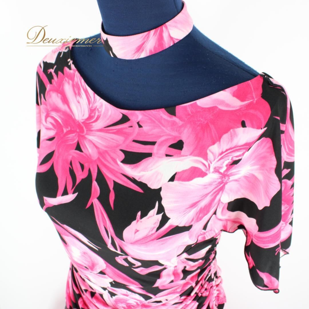 【美品 日本製社交ダンス衣装】ワンピース ドレス チョーカー threering ピンク ブラック 黒 白 ホワイト 花柄 派手 Mサイズ