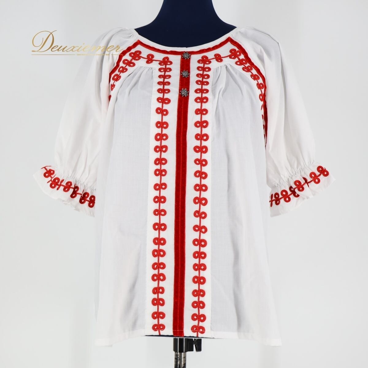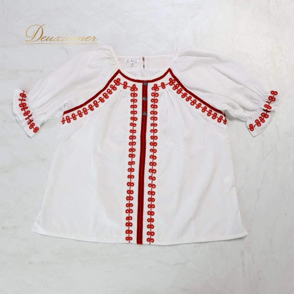 【美品 フォークダンス衣装】ホワイト LOUIS トップス ブラウス 白 赤 レッド ボタン 爽やか 明るい 絞り 五分袖 かわいい
