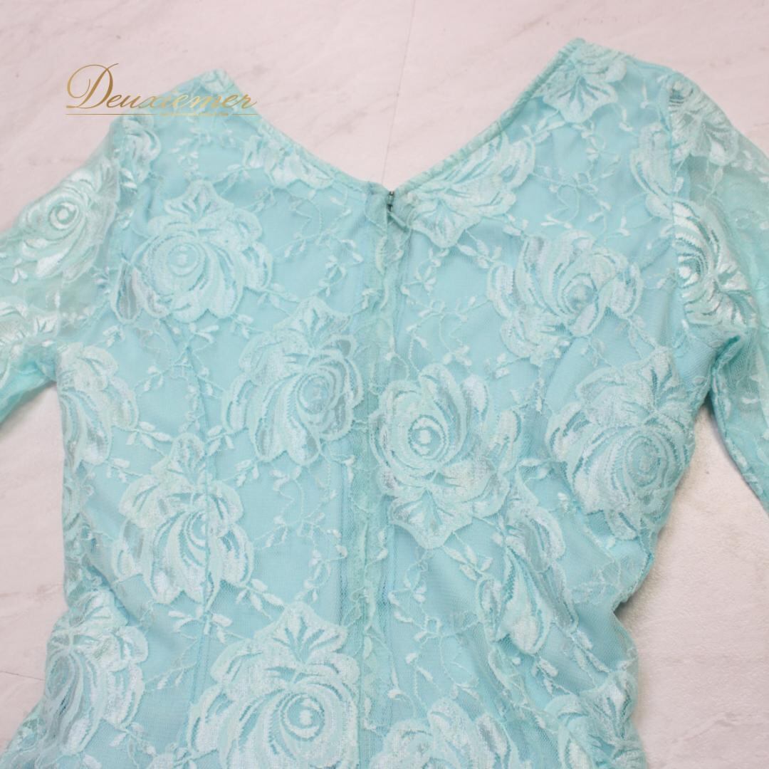【美品 社交ダンス衣装】ワンピース ドレス leirena レイリーナ 水色 ライトブルー 花柄 ラインストーン レース 長袖 かわいい