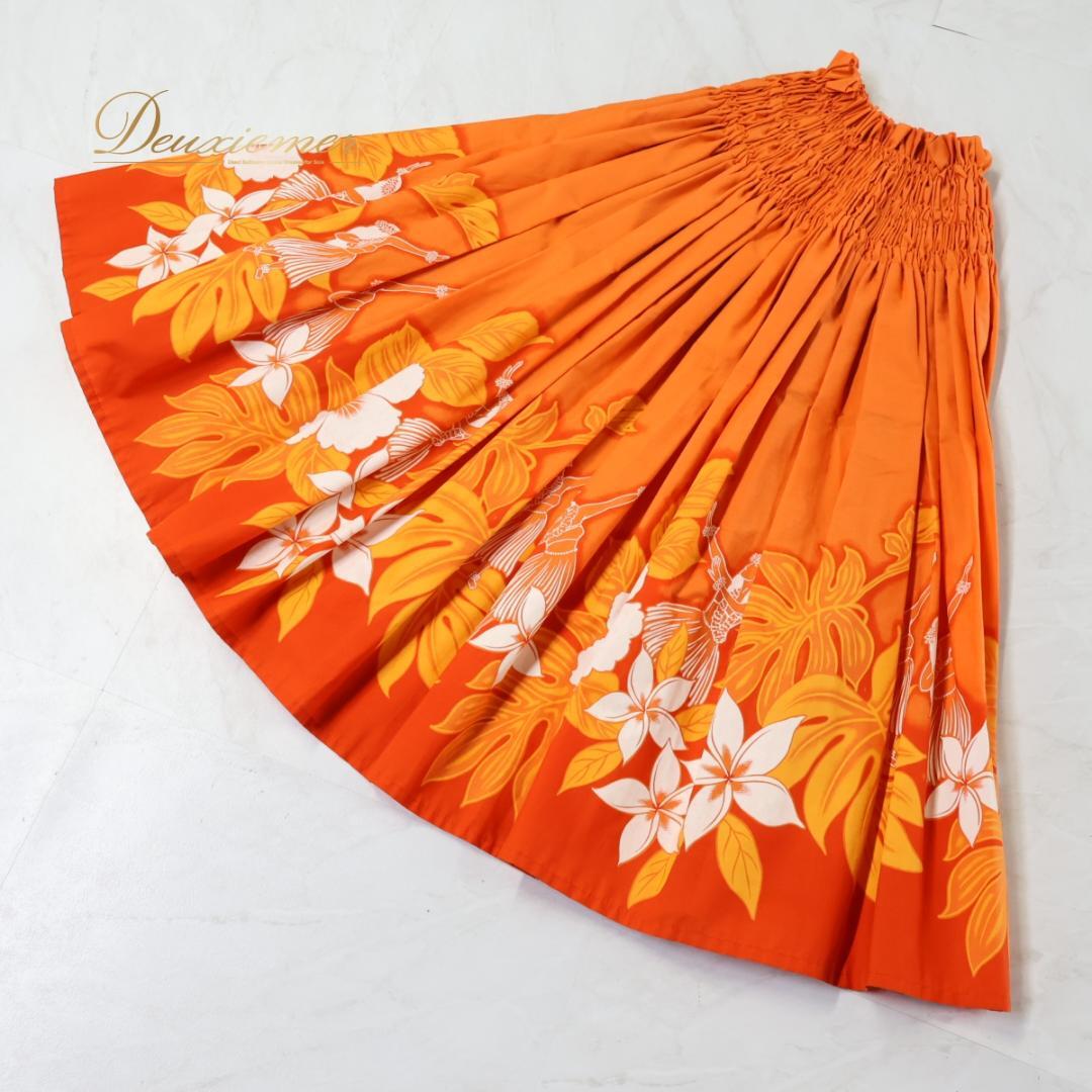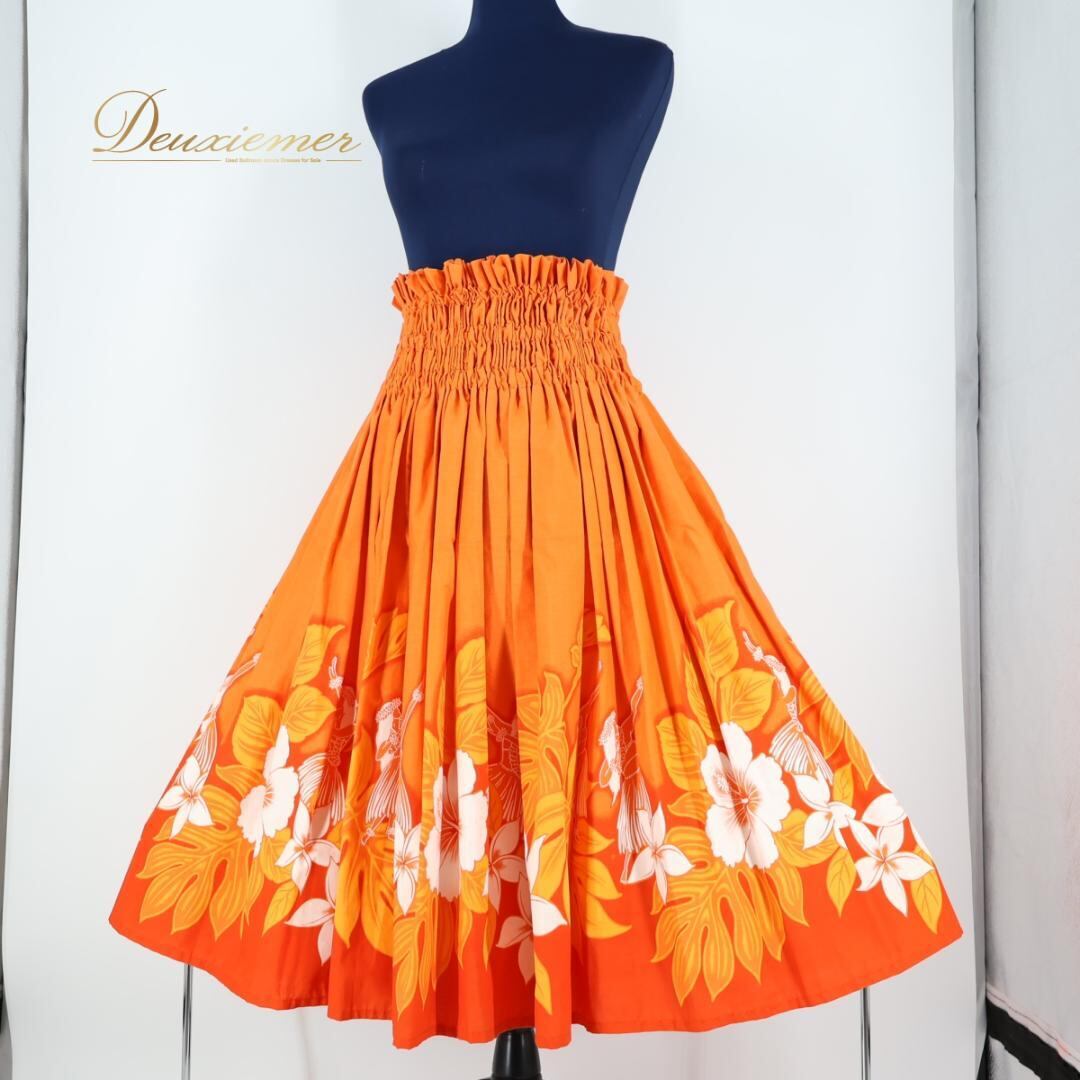 【ハワイ製 フラダンス衣装】オレンジ パウスカート ハイビスカス柄 プルメリア柄 白 ホワイト 鮮やか 華やか アロハ かわいい