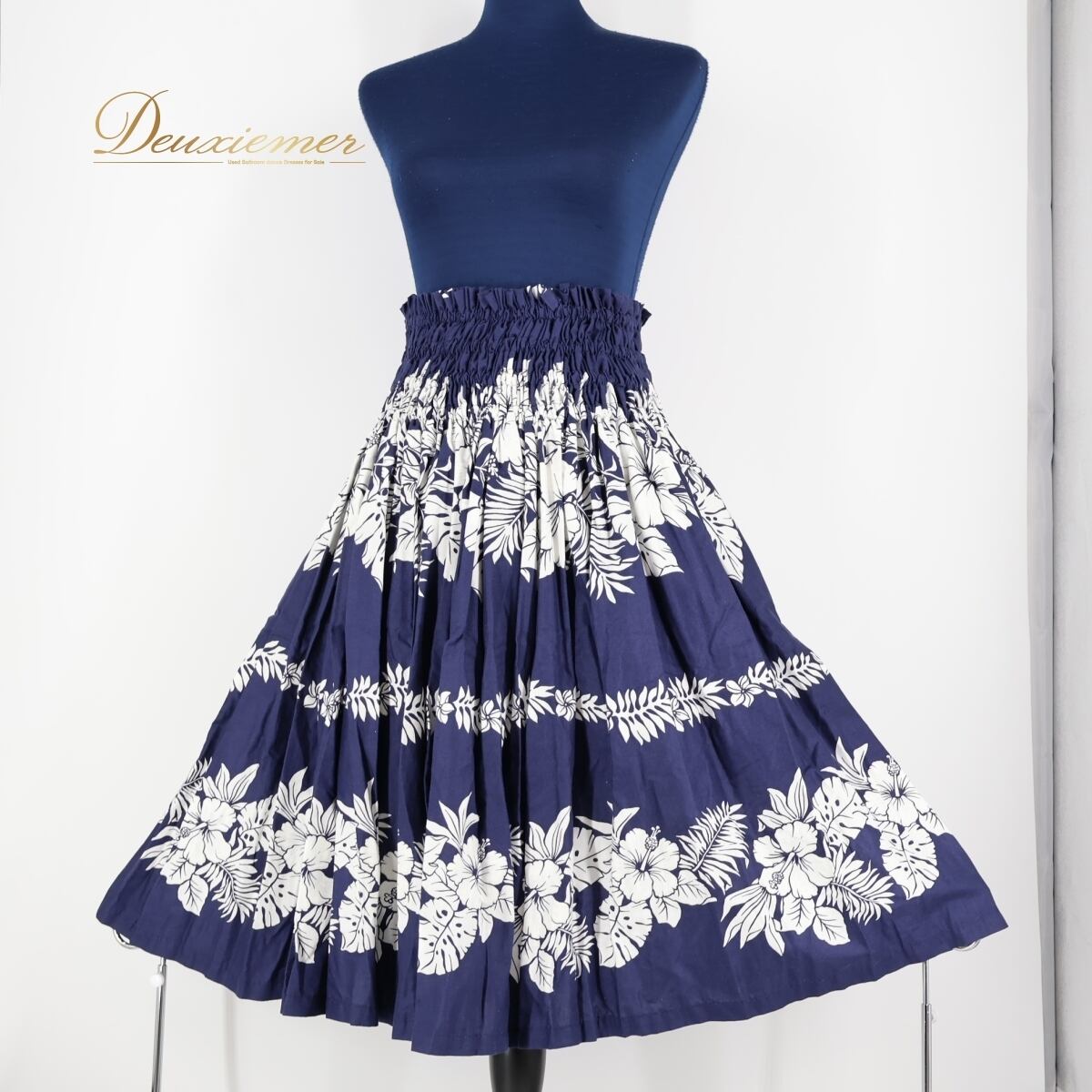 【フラダンス衣装】ネイビー パウスカート 紺 白 ハイビスカス柄 モンステラ柄 花柄 ハワイアン アロハ 華やか かわいい ゴム