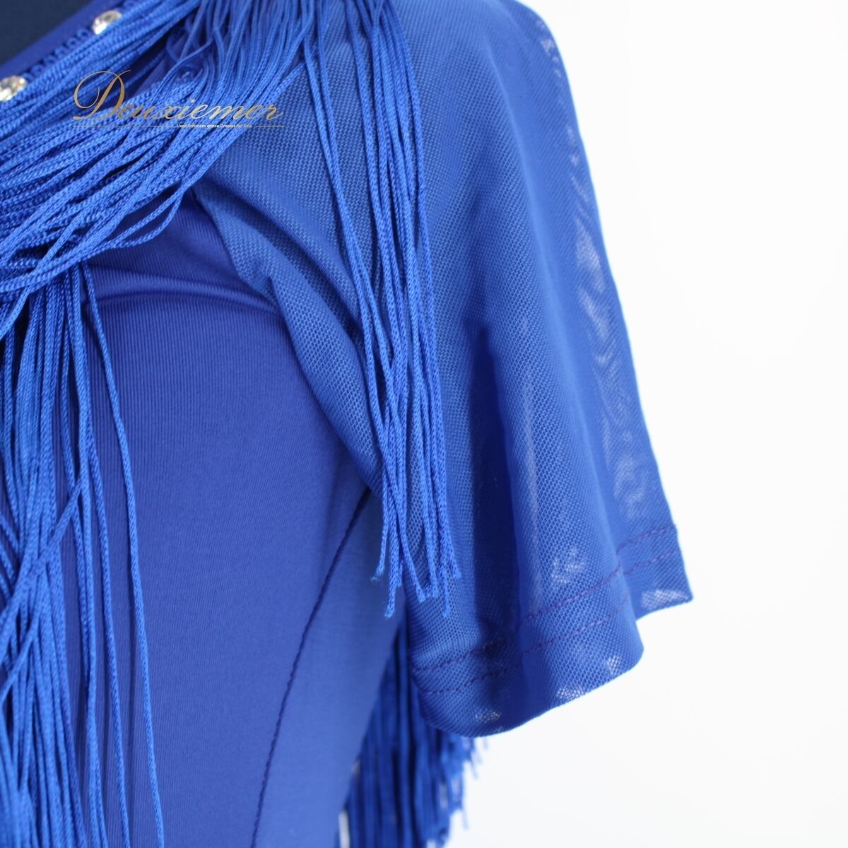 【社交ダンス衣装】ブルー ラテン ドレス ワンピース 青 フリンジ 軽い 伸縮 半袖 デモ 競技用 パーティ 発表会 ダンス用