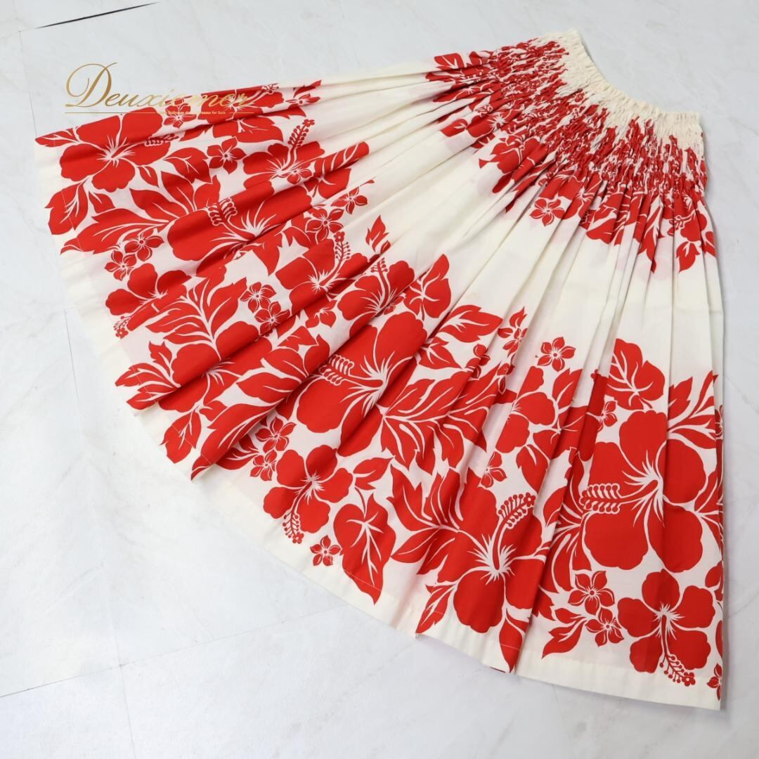 【フラダンス衣装】ホワイト パウスカート 白 赤 ハイビスカス柄 花柄 爽やか 鮮やか ハワイアン アロハ シャーリング 可愛い