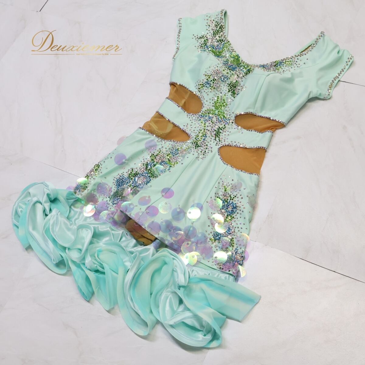 #社交ダンス #ダンス衣装 #ラテンドレス #ワンピース #ツキオカ #競技用 #デモ用 #明るい色 #フリル #華やか #ストレッチ #快適 #女性らしい #衣装 #ダンスファッション #エレガント #ミントグリーン #ダンススタイル #装飾 #ENUTSU