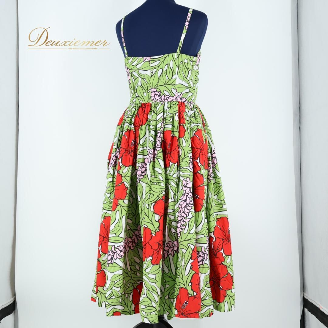【フラダンス衣装】ライトグリーン ワンピース ドレス マイレ柄 ハイビスカス柄 白 赤 ピンク 黄緑 キャミソール ホワイト ①