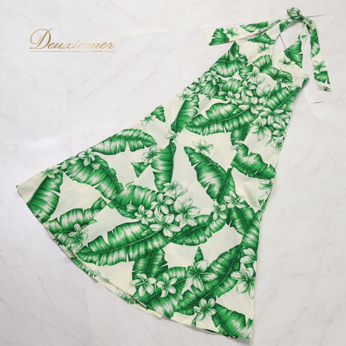 【美品 フラダンス衣装】ホワイト ワンピース ドレス プルメリア柄 白 緑 ホルターネック 爽やか グリーン アロハ かわいい 花