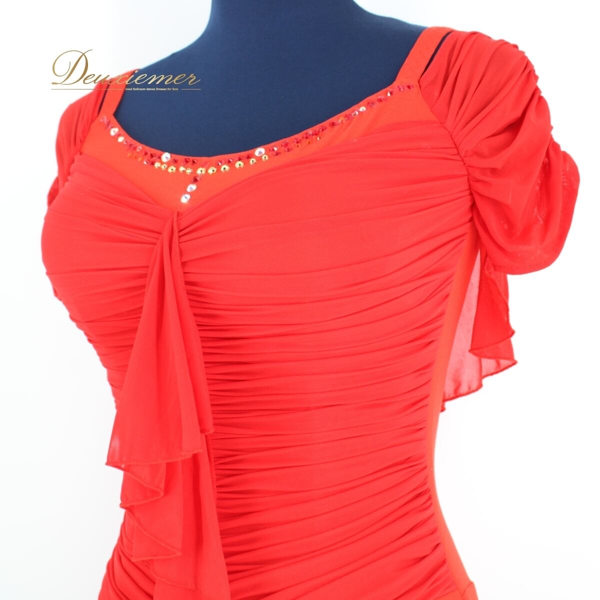 【社交ダンス衣装】レッド ワンピース ドレス 赤 無地 軽い 伸縮 ストレッチ フリル レース パーティ 発表会 レディース