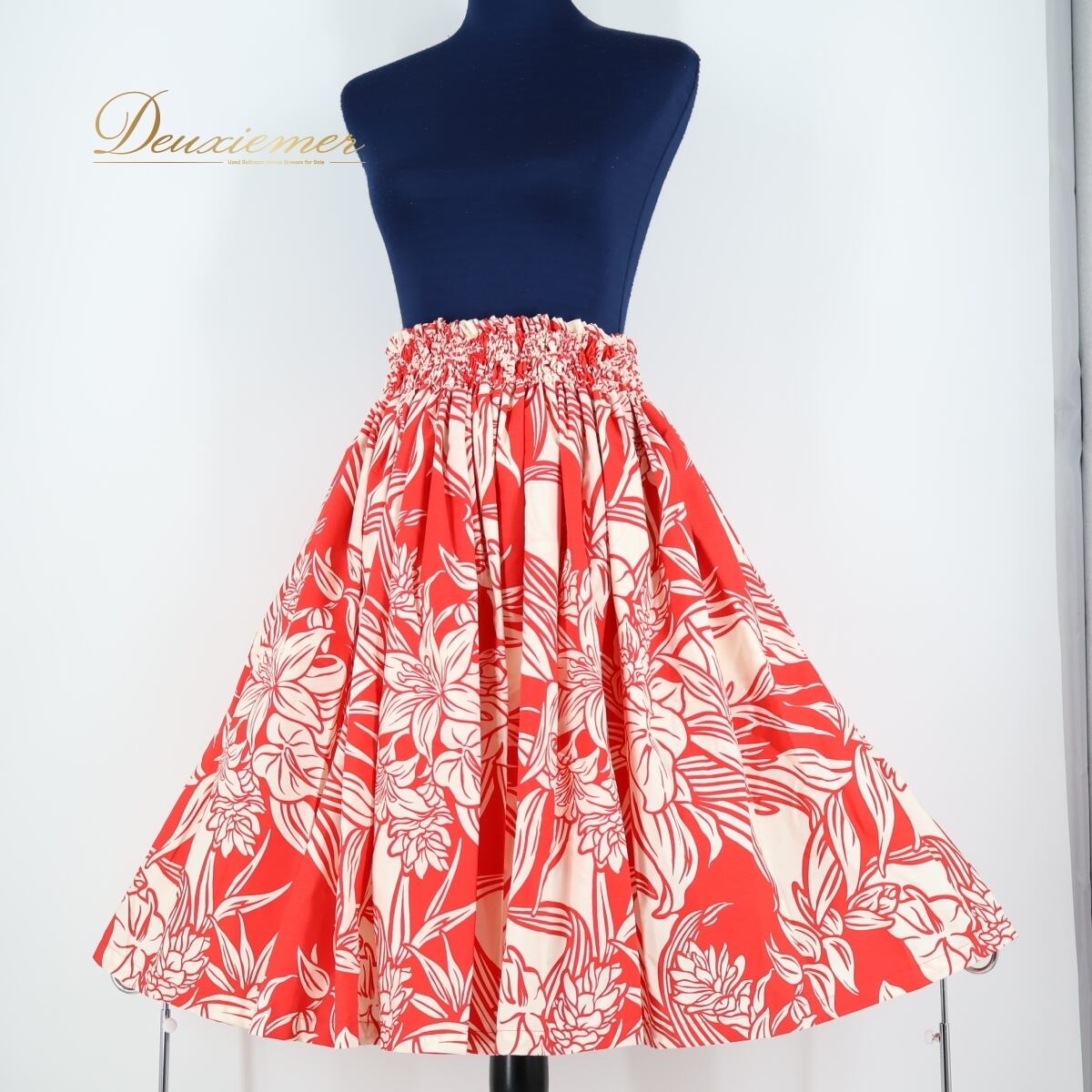 【美品 フラダンス衣装】レッド パウスカート 赤 白 ホワイト 花柄 鮮やか 華やか ハワイアンプリント アロハ ふんわり 可愛い