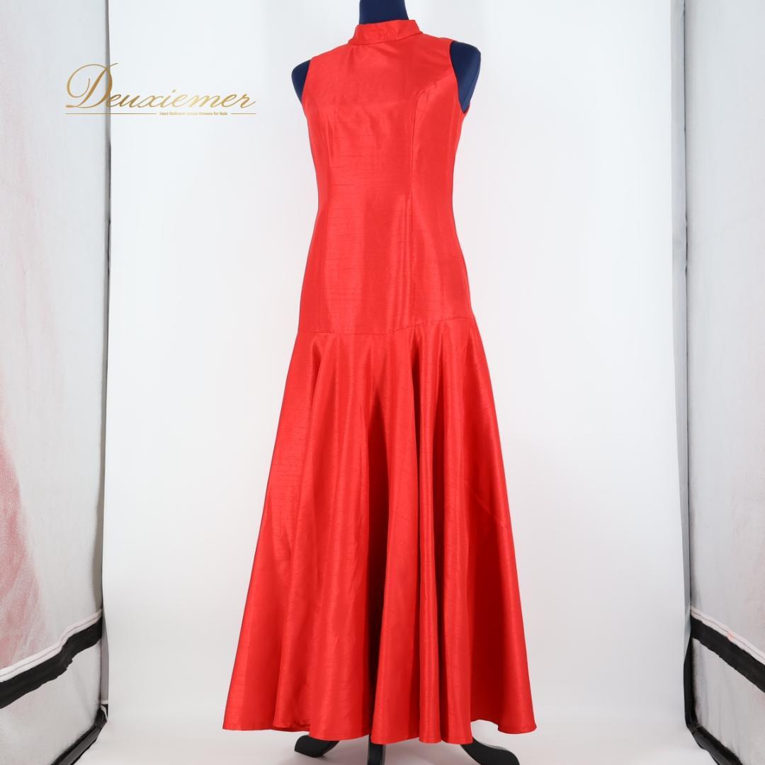 【美品 日本製 フラダンス衣装】レッド Paondor パンドール ワンピース ドレス 赤 光沢 無地 ノースリーブ 袖なし 上品 鮮やか