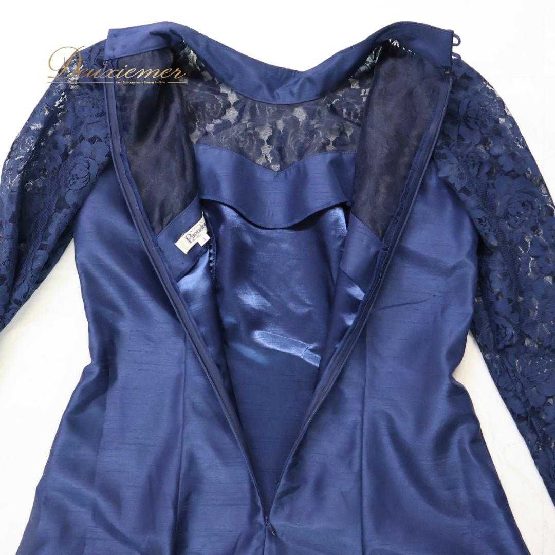 【美品 日本製 フラダンス衣装】ネイビー Paondor パンドール ワンピース ドレス 紺 長袖 レース 花 光沢 上品 華やか アロハ