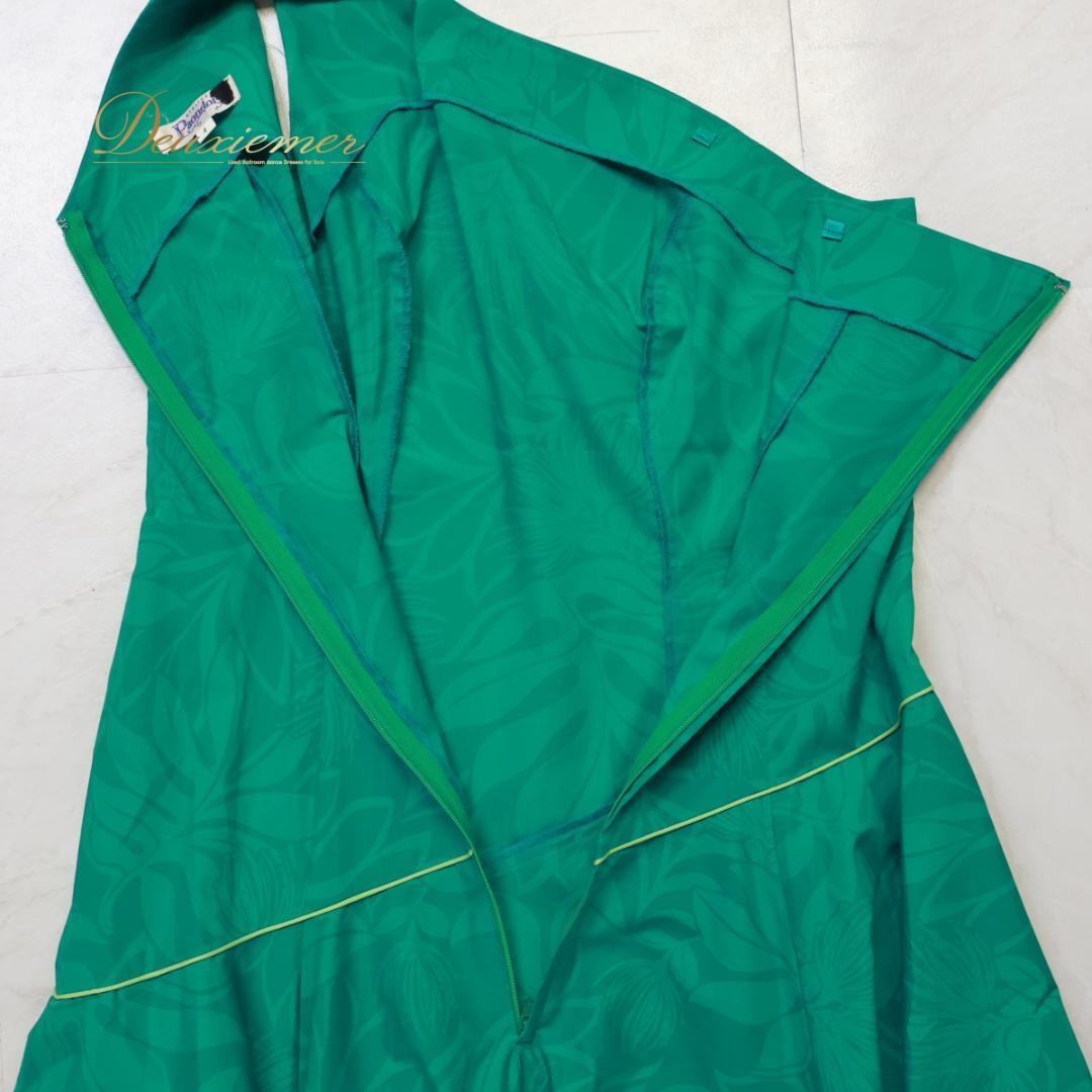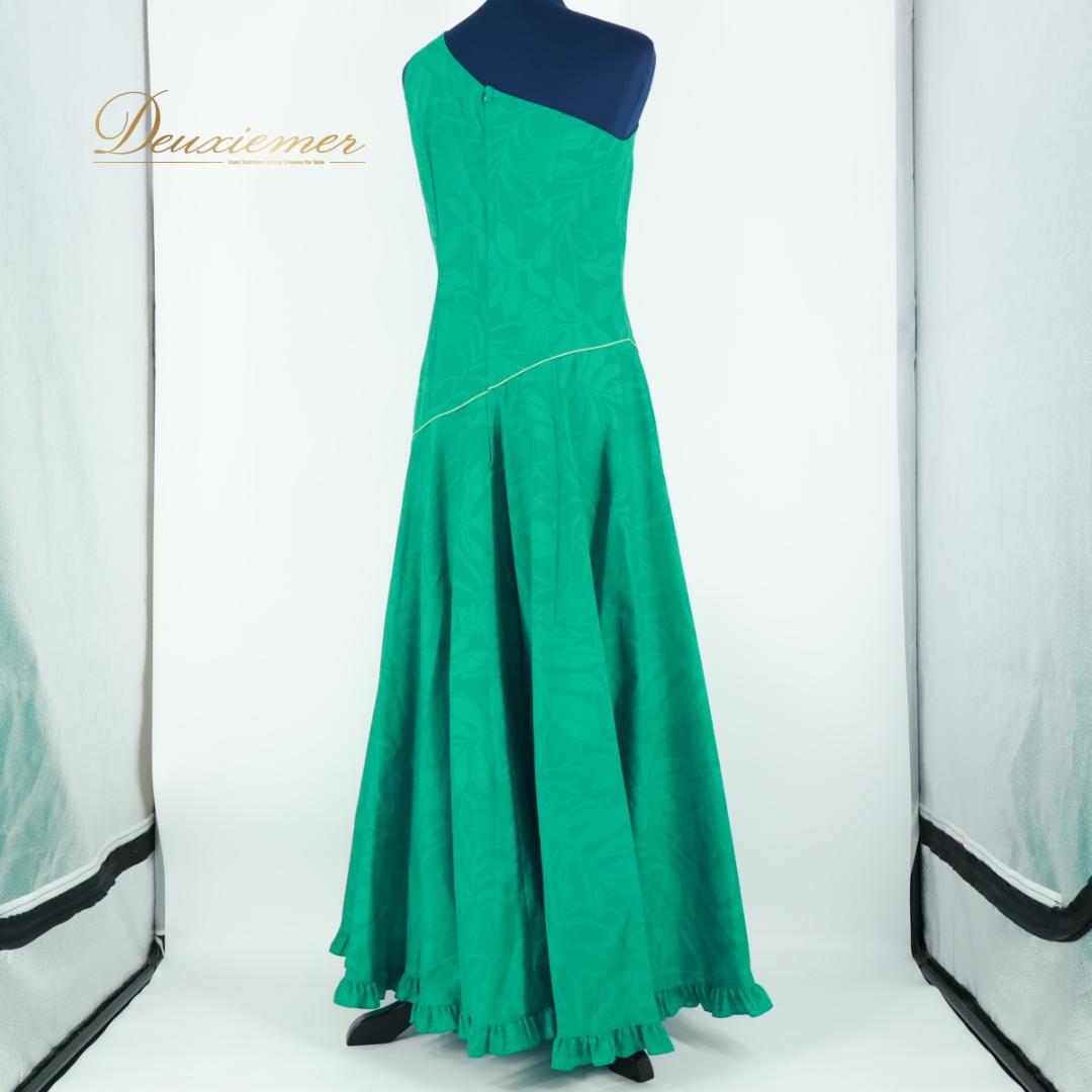【美品 日本製 フラダンス衣装】グリーン Paondor パンドール ワンピース ドレス 緑 レフア柄 ワンショルダー フリル 可愛い