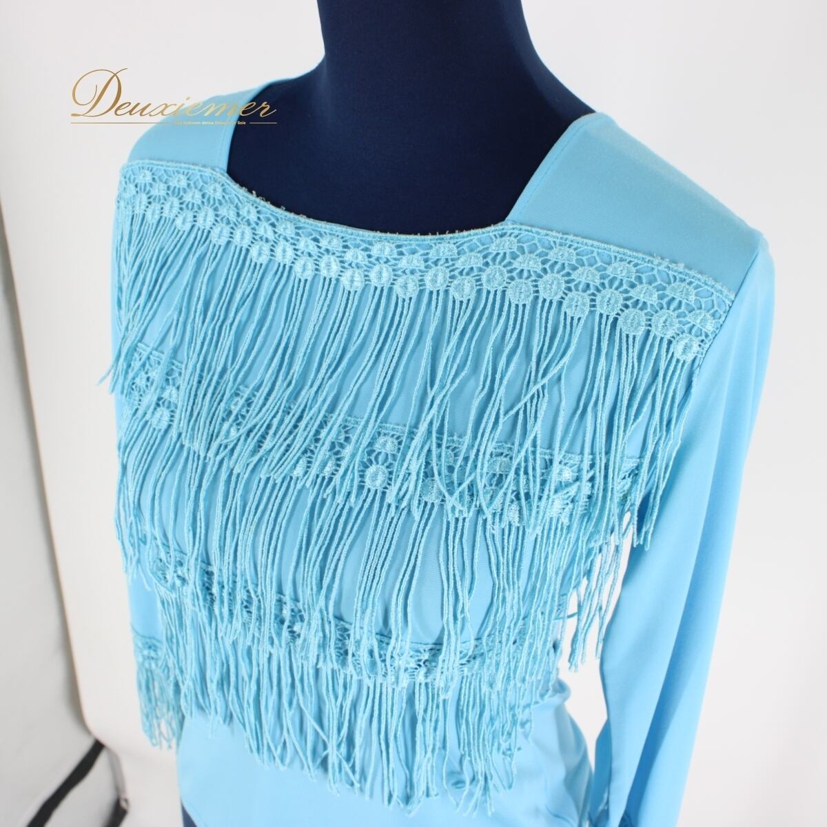【社交ダンス衣装】トップス レッスンウェア 練習着 Mサイズ 水色 ライトブルー フリンジ かわいい 可愛い 長袖 上品