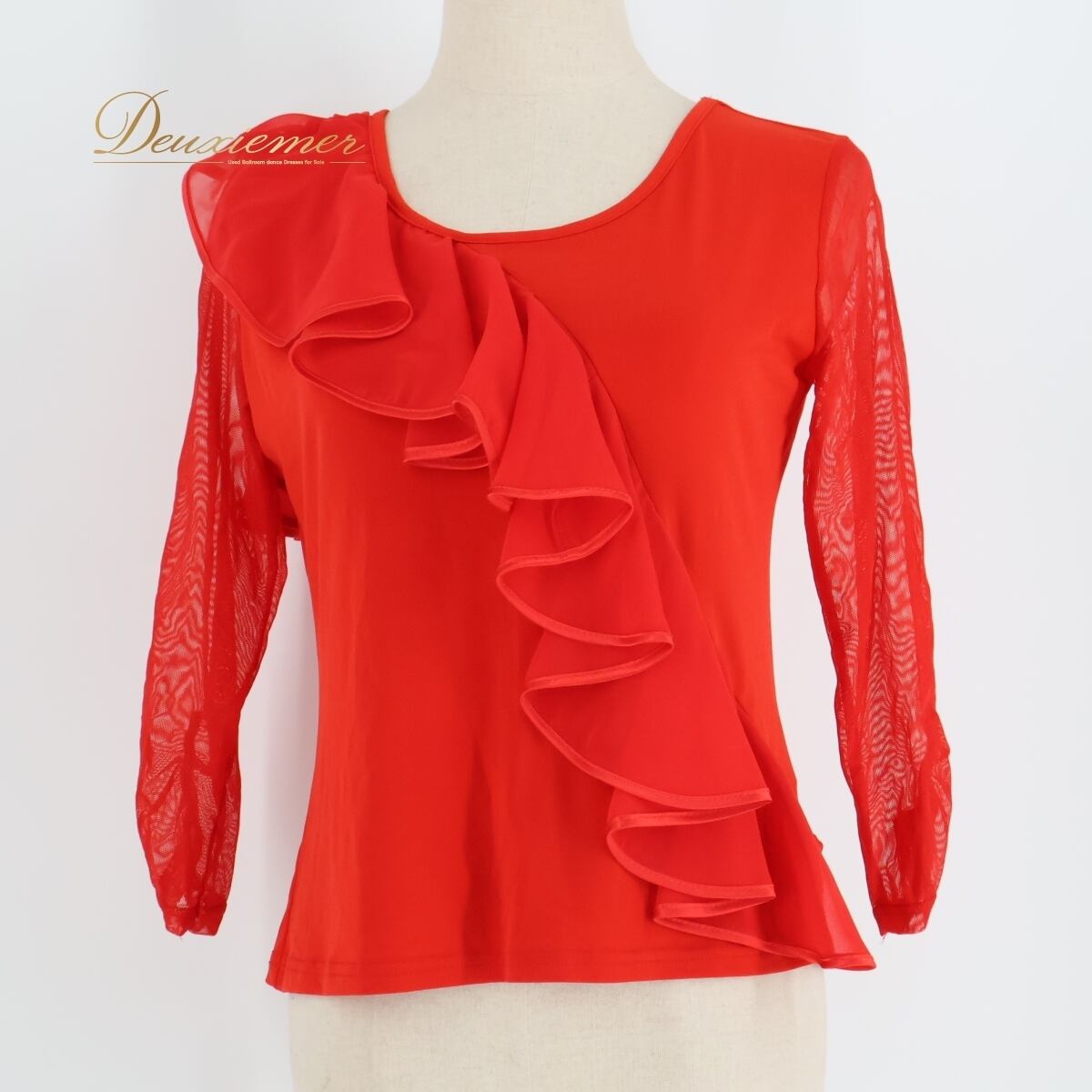 【美品 社交ダンス衣装】レッド create-sun クリエイトサン ブラウス トップス 赤 レース フリル 伸縮 レッスン 練習着 無地