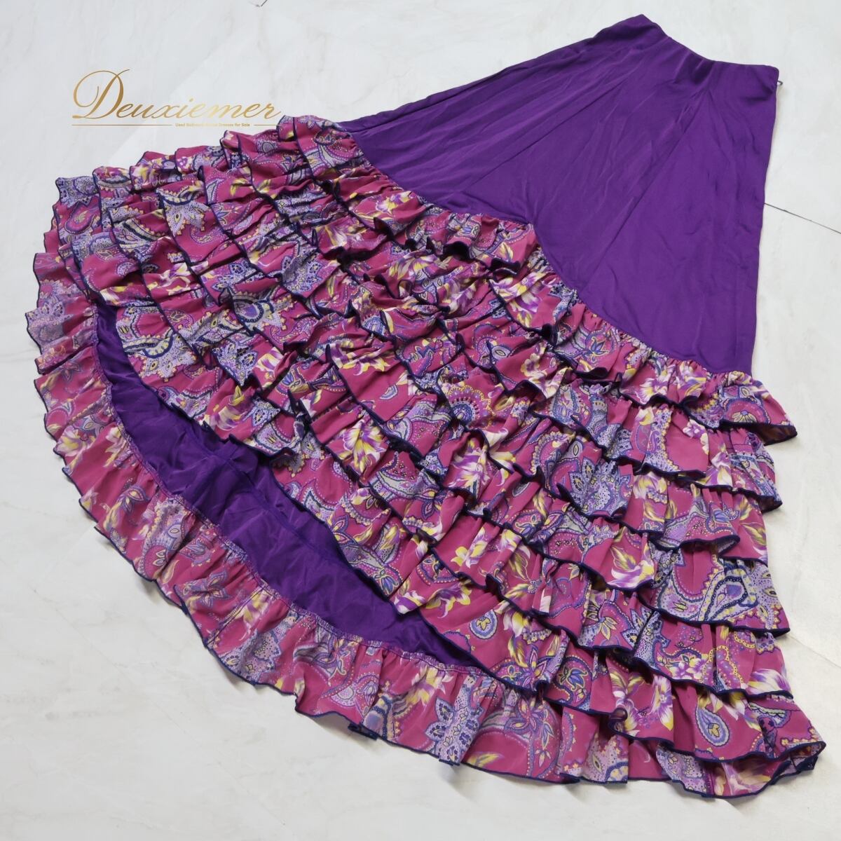 【フラメンコ衣装】パープル ファルダ スカート ボランテ フリル 紫 花柄 ピンク ラベンダー ダンス用 発表会 パーティ 段々 スタイル おしゃれ 伸縮性 サイドファスナー 豪華