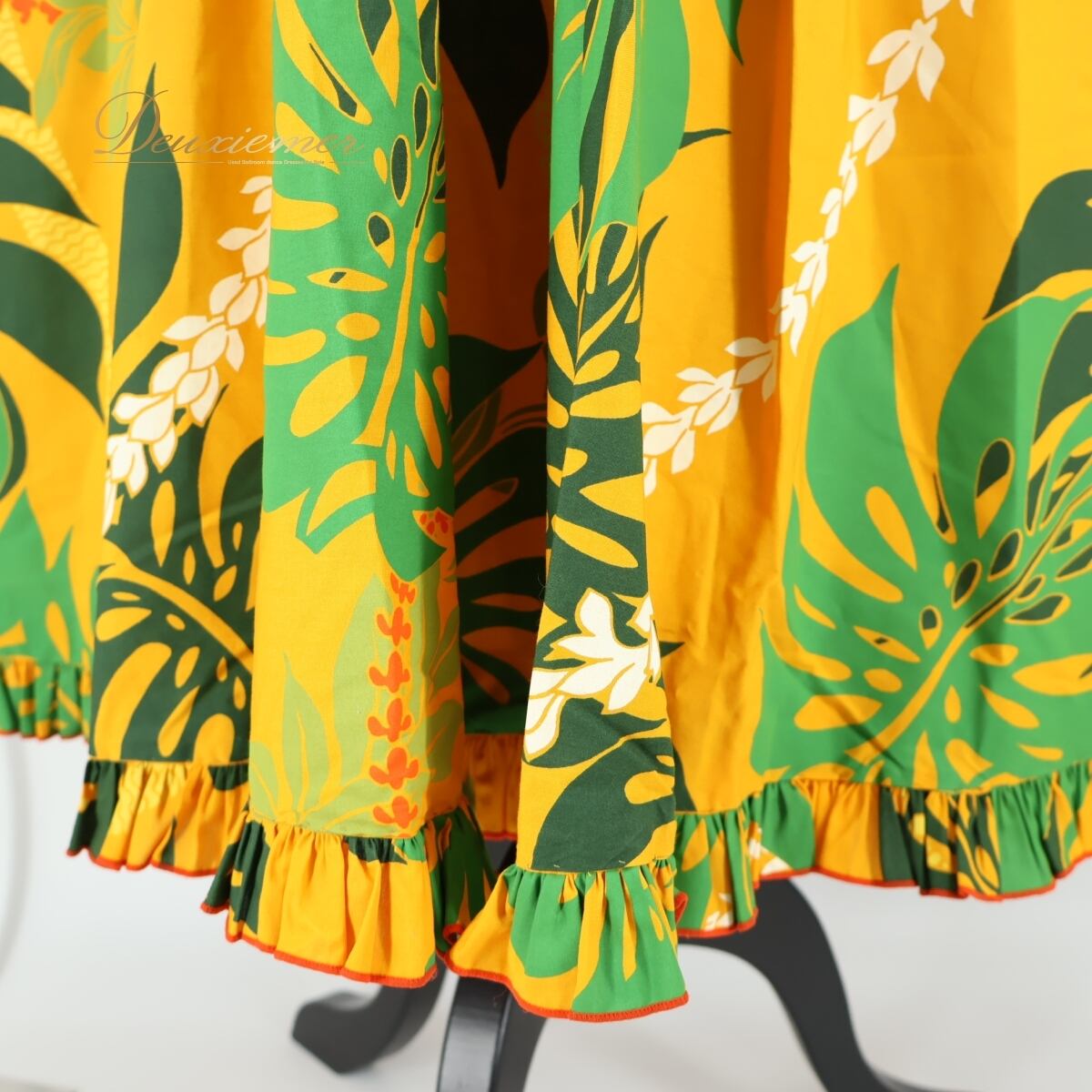 【フラダンス衣装】イエロー ワンピース ドレス 山吹色 黄緑 緑 フリル モンステラ柄 鮮やか 華やか ハワイアン アロハ 可愛い