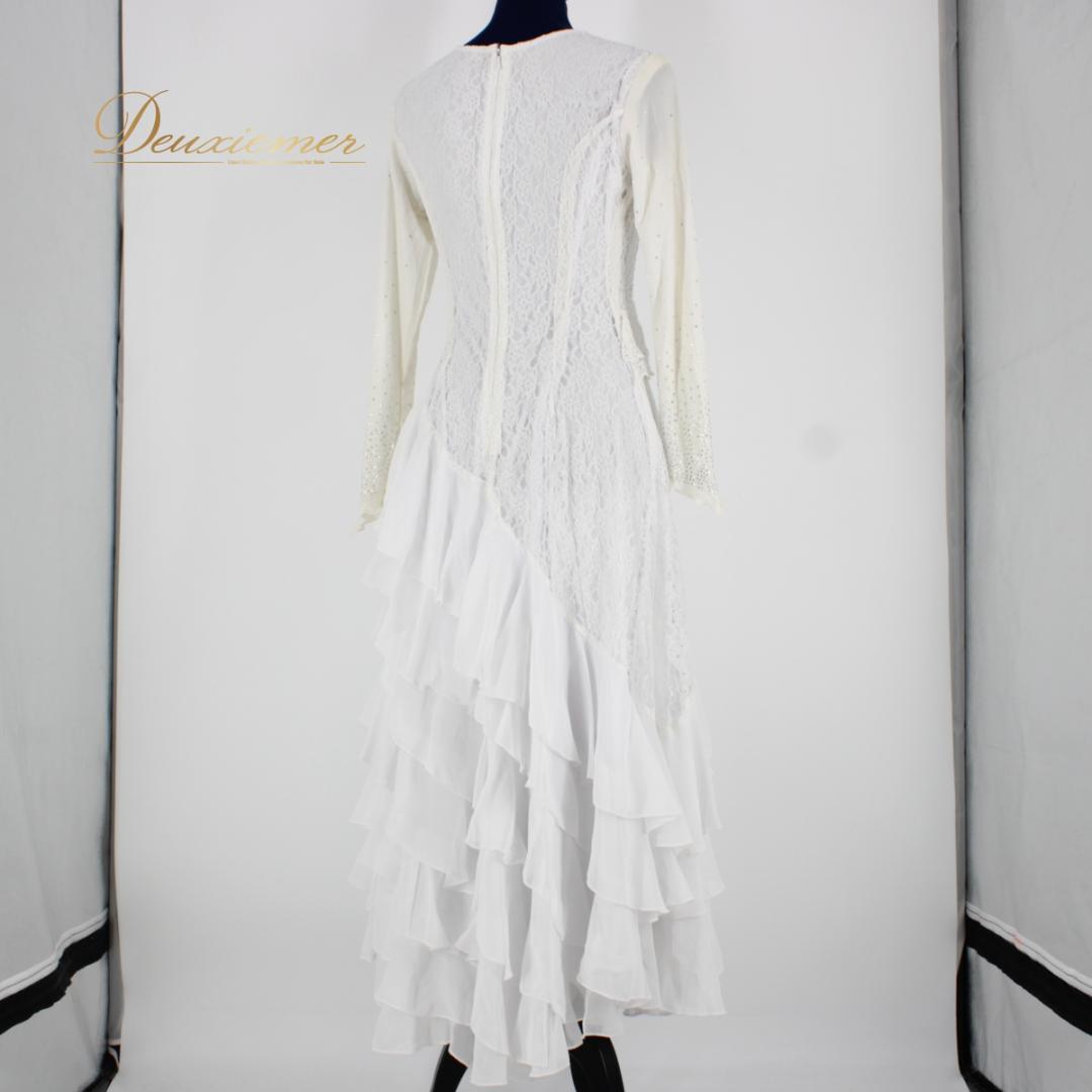 【美品 社交ダンス衣装】ワンピース ドレス 白 ホワイト ラインストーン 長袖 レース 華やか 派手 上品 清楚 フリル かわいい