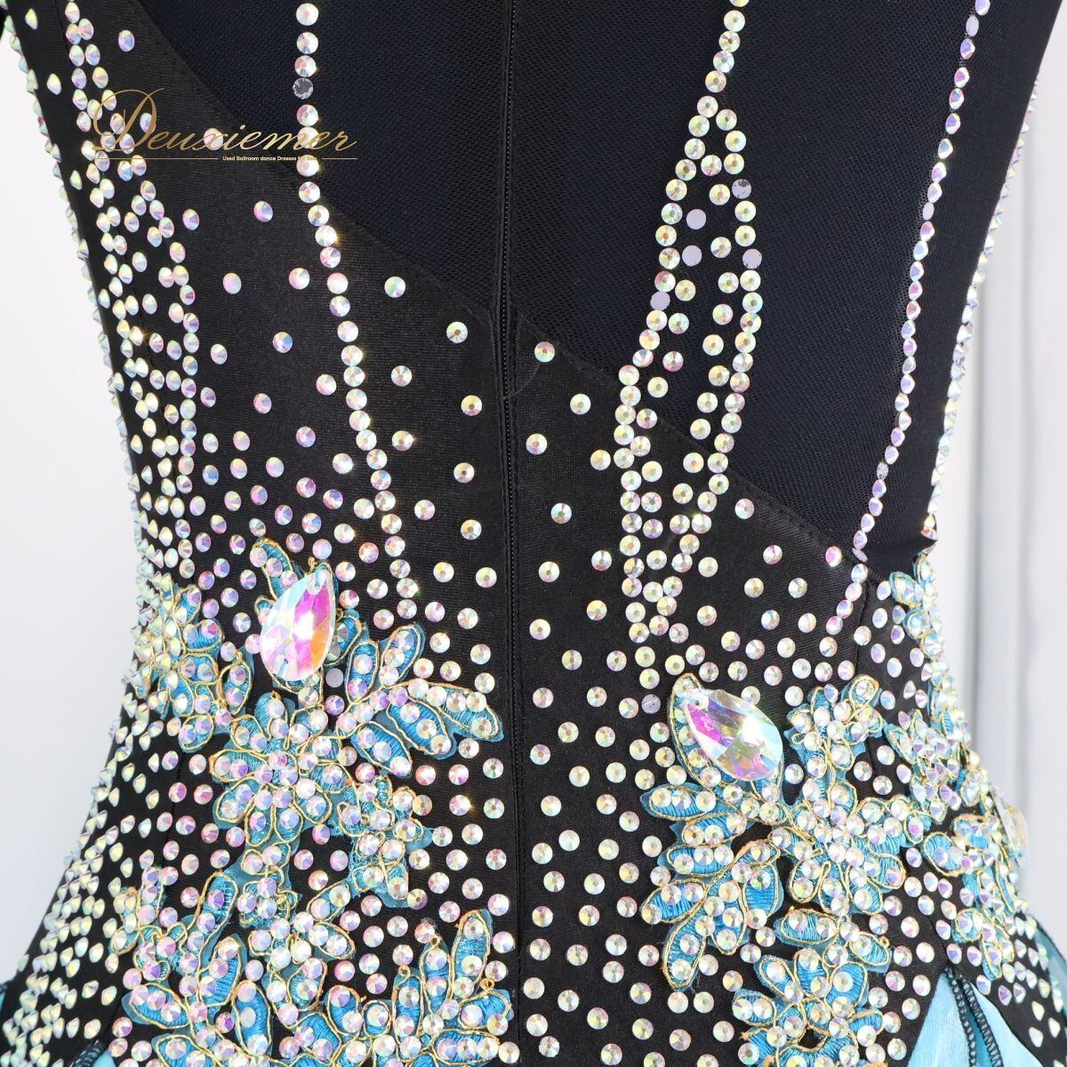 【社交ダンス衣装】ブルー ワンピース ドレス 黒 青 水色 ブラック フリル レース プリーツ フロート デモ 競技用 発表会