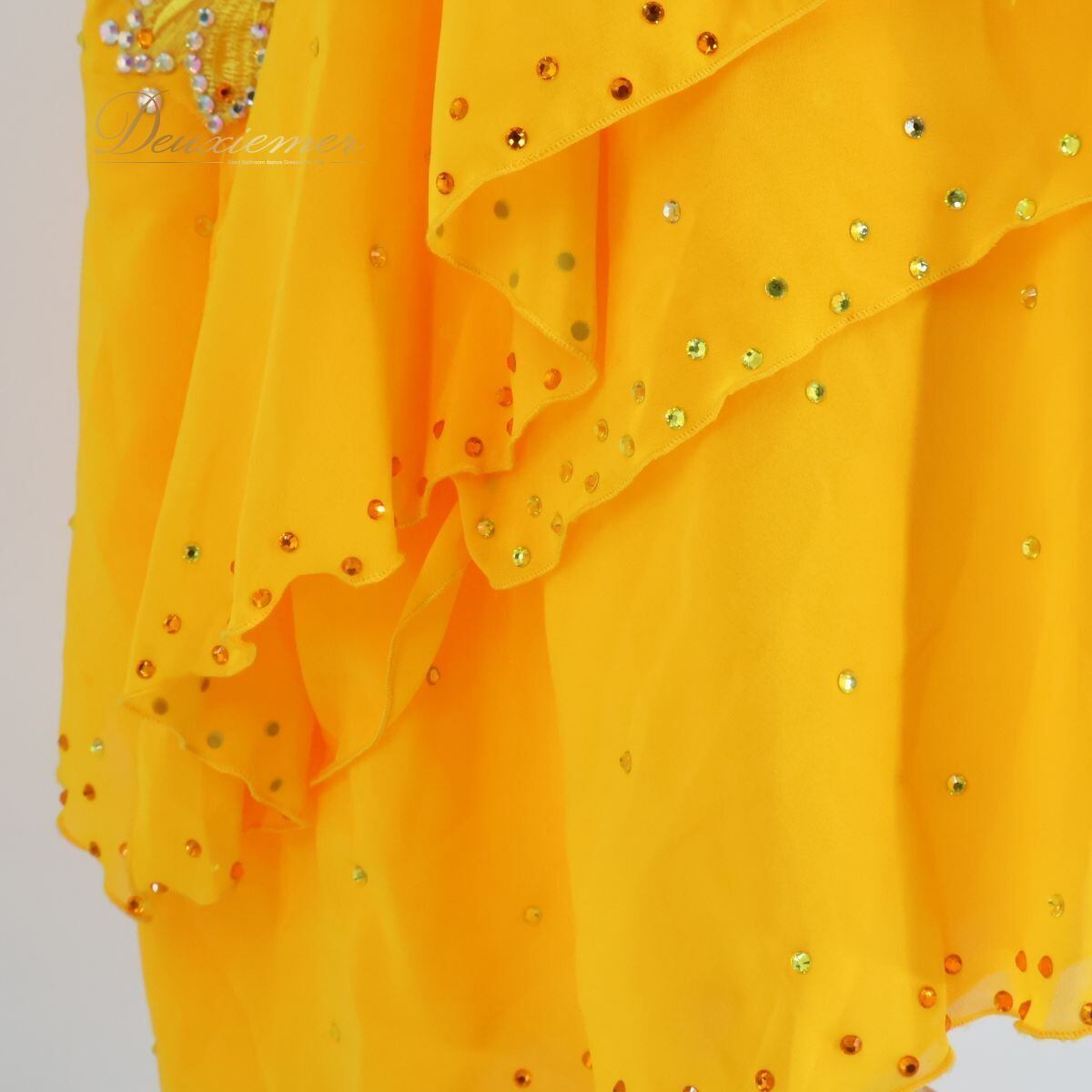 【美品 社交ダンス衣装】イエロー ラテン ドレス ワンピース 黄色 デモ 競技用 長袖 レース フリル 発表会 レディース