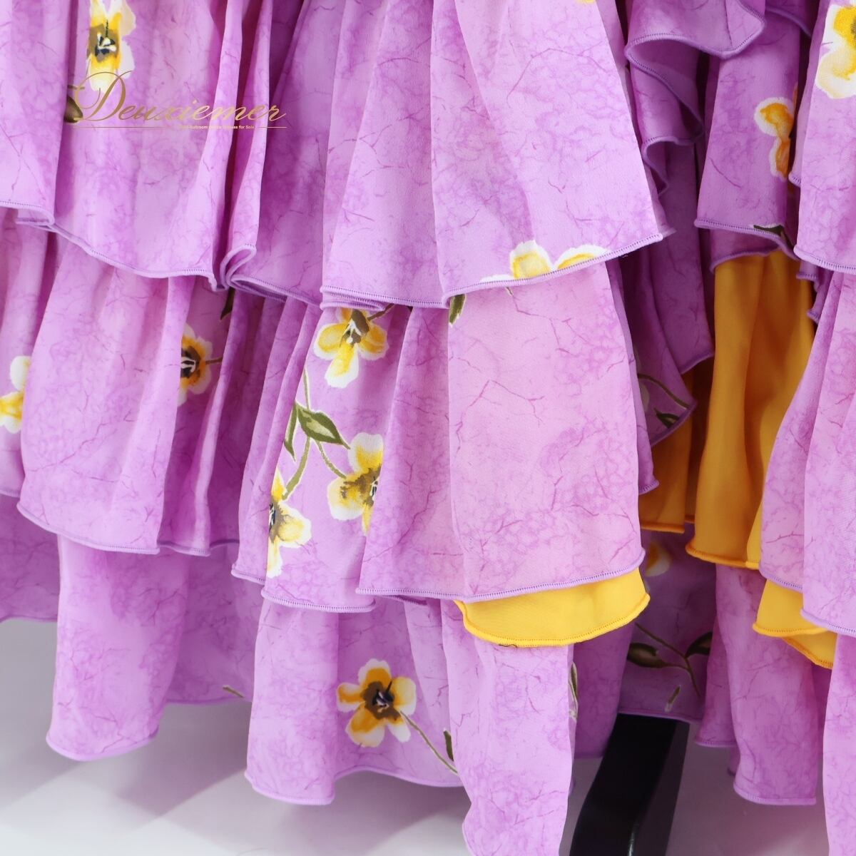 【美品 フラメンコ衣装】パープル ワンピース ドレス 紫 ボランテ フリル シージョ 黄色 フレコ ボリューム 大きい 花柄